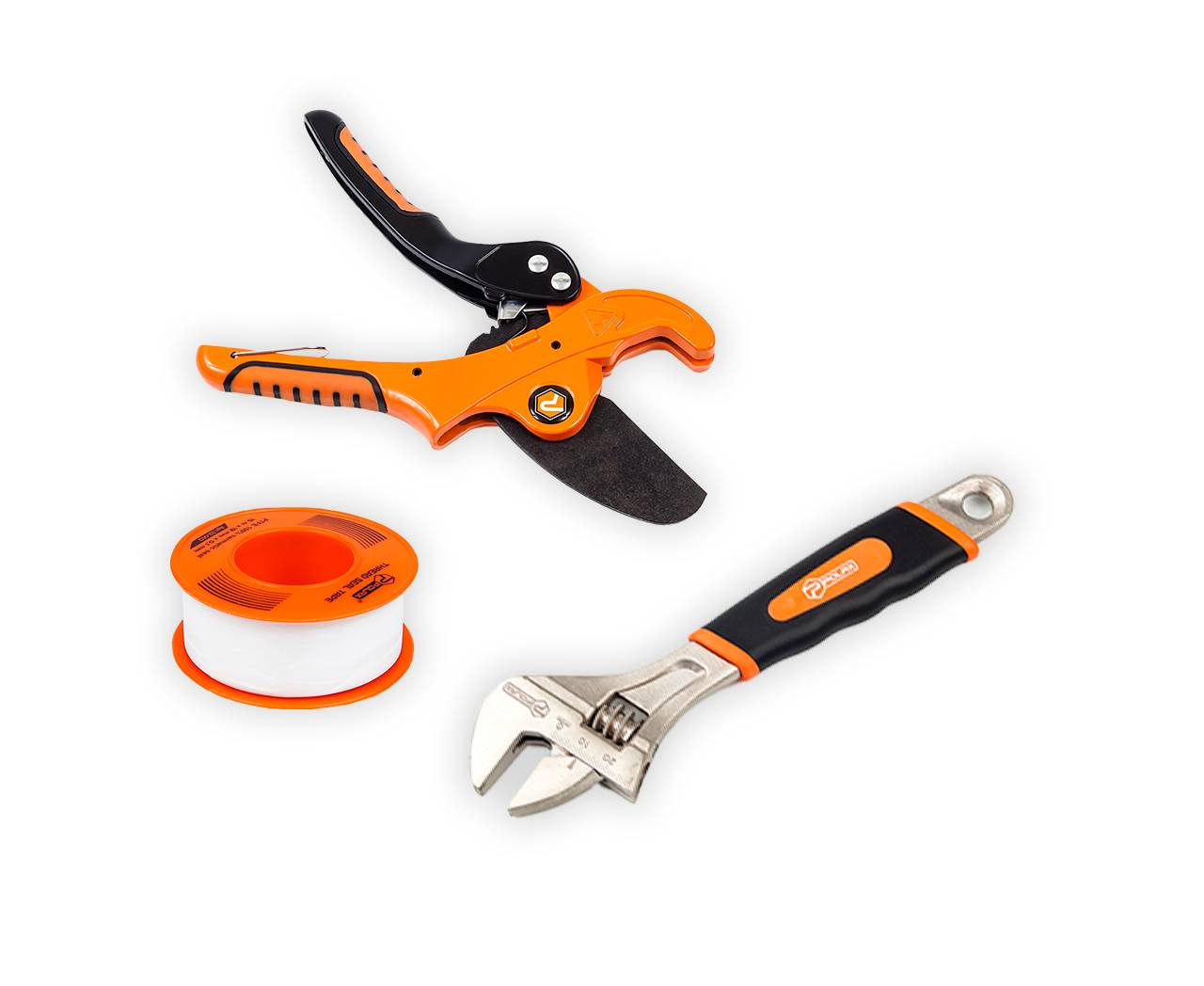 Характеристики товара Набір трубний Стандарт Polax труборіз 3-42 мм товщина 2.8 мм тефлонова стрічка 15м та ключ розвідний 250 мм (335-14)