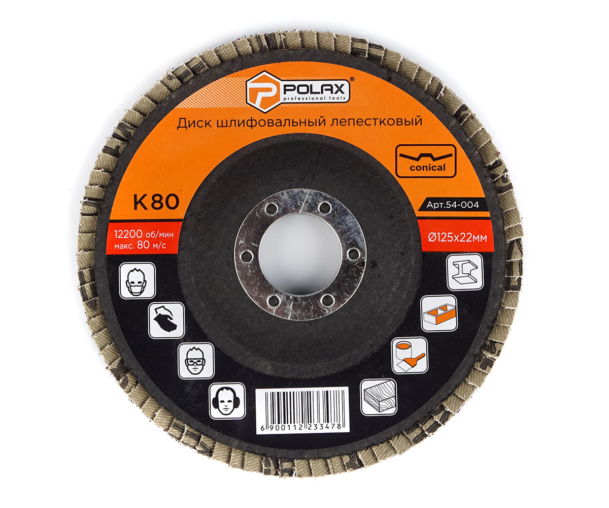Характеристики товара Круг (диск) Polax шлифовальный лепестковый для УШМ (болгарки) 125 * 22мм, зерно K80 (54-004)