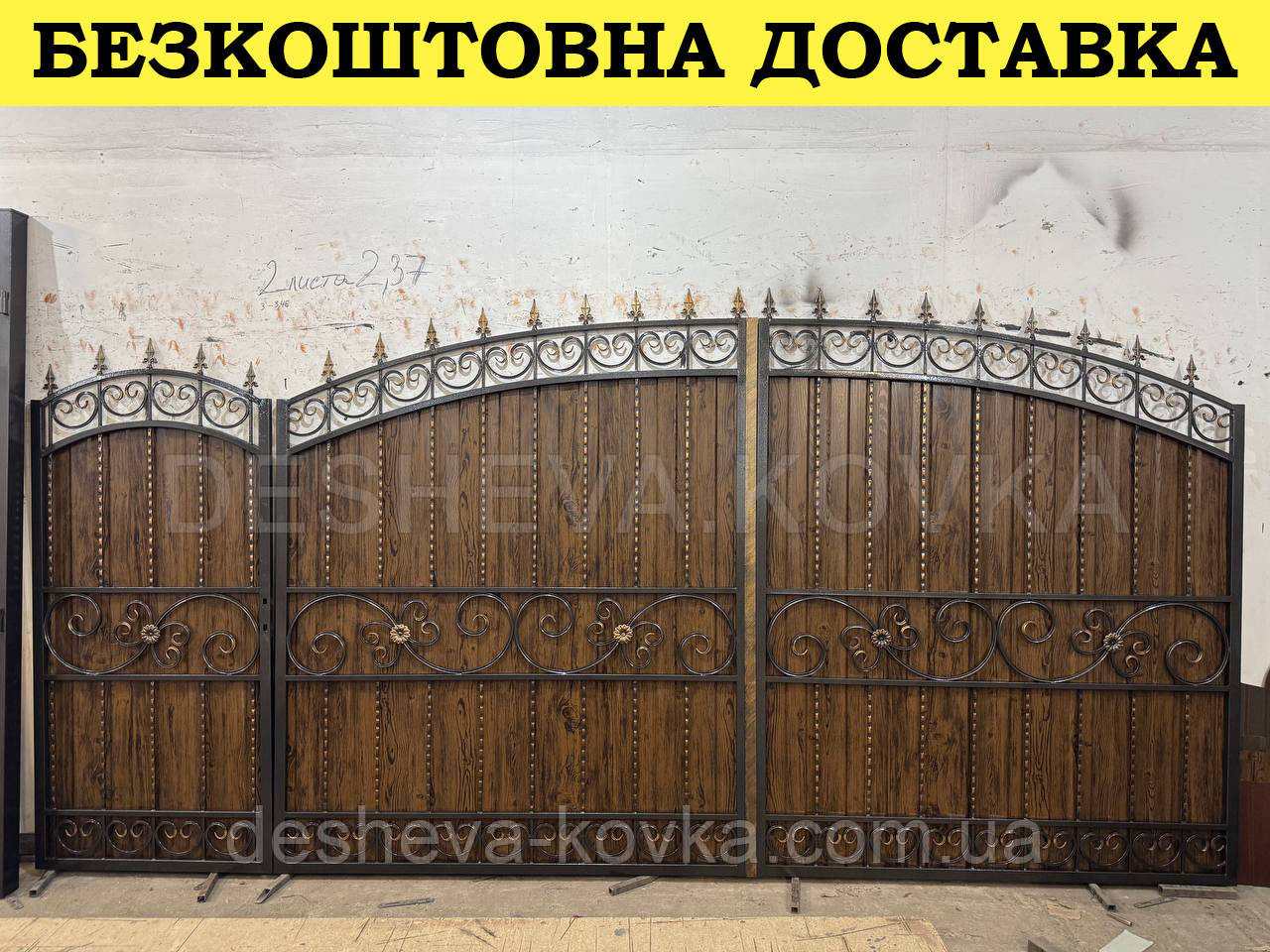 Кованые ворота из профнастила из ковкой Код: А-0184 Мы изготовим ворота индивидуально по вашим размерам за 4 рабочих дня. Наши ворота производятся на современном оборудовании специалистами нашей компании, что гарантирует скорость и качество. Уличные ворота из профнастила отлично подходят для обустройства въезда во двор частного дома. Классические конструкции не зря пользуются спросом на протяжении нескольких веков: они хорошо выполняют свои функции, оставаясь простыми и удобными в использовании. Изделие может иметь любую форму и дизайн: из-за его технических особенностей ограничений в возможностях декорирования практически нет. БЕСПЛАТНАЯ доставка по всей Украине! (Доставка курьером до Вашего дома, в любой город/село Украины.) По желанию заказчика калитка может быть справой или с левой стороны. Стандартные размеры: Ворота: 3.4м х 1.7м по столбикам. Калитка: 0.9м х 1.7м по столбикам. Также мы можем изготовить ворота индивидуально по размерам заказчика. Цвет профнастила по выбору! Наша компания является одним из самых больших производств на рынке Украины. Звоните и мы Вас проконсультируем +380965364101.