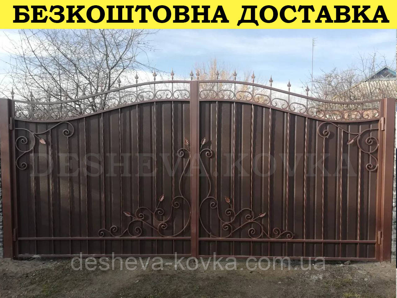 Ворота кованые из профнастилом и калиткой Код: А-01226 Мы изготовим ворота индивидуально по вашим размерам за 4 рабочих дня. Наши ворота производятся на современном оборудовании специалистами нашей компании, что гарантирует скорость и качество. Уличные ворота из профнастила отлично подходят для обустройства въезда во двор частного дома. Классические конструкции не зря пользуются спросом на протяжении нескольких веков: они хорошо выполняют свои функции, оставаясь простыми и удобными в использовании. Изделие может иметь любую форму и дизайн: из-за его технических особенностей ограничений в возможностях декорирования практически нет. БЕСПЛАТНАЯ доставка по всей Украине! (Доставка курьером до Вашего дома, в любой город/село Украины.) По желанию заказчика калитка может быть справой или с левой стороны. Стандартные размеры: Ворота: 3.4м х 1.7м по столбикам. Калитка: 0.9м х 1.7м по столбикам. Также мы можем изготовить ворота индивидуально по размерам заказчика. Цвет профнастила по выбору! Наша компания является одним из самых больших производств на рынке Украины. Звоните и мы Вас проконсультируем +380965364101.