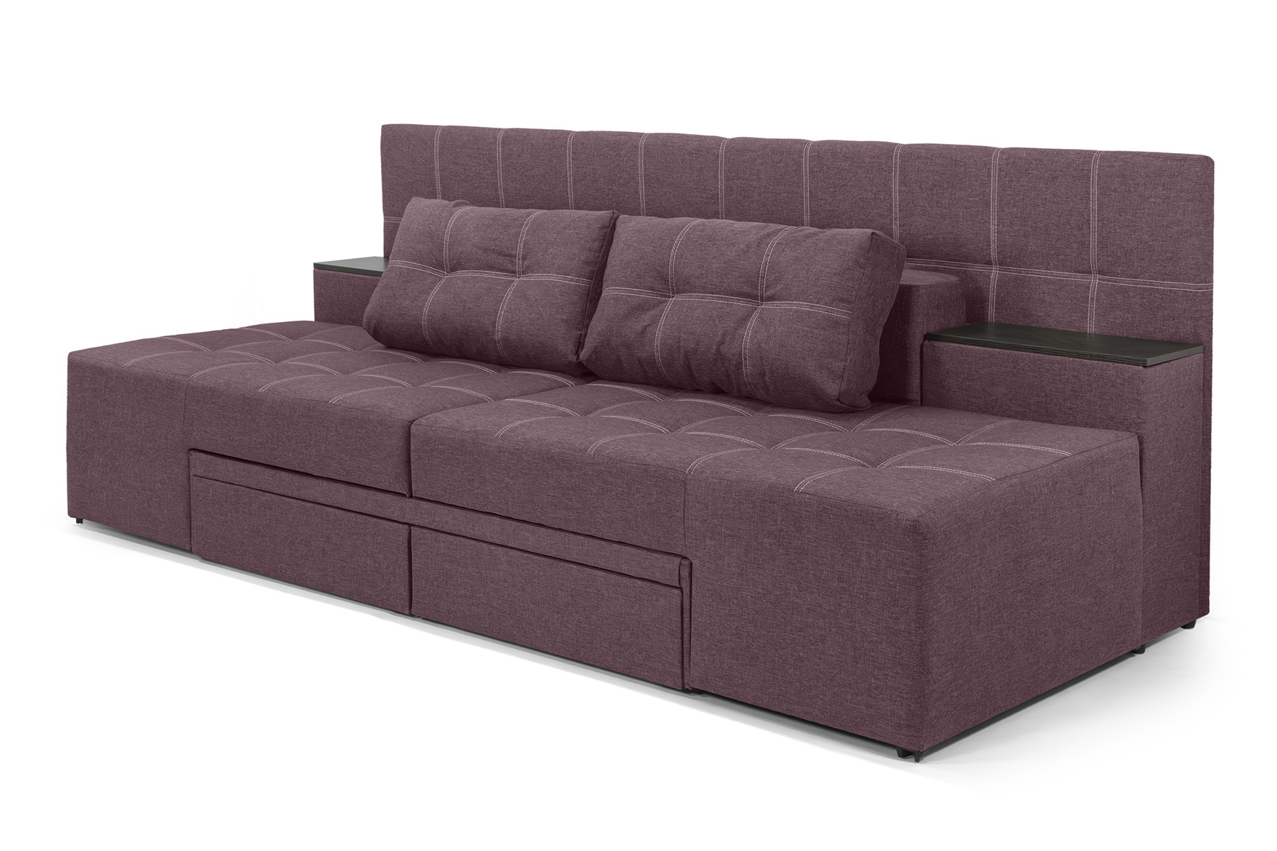 Механізм з'єднання створює враження цілісного ліжка, це забезпечує максимальний комфорт під час сну. Приліжкові тумбочки вносять практичність у кімнату, забезпечуючи зручне місце для зберігання.Чотири ніші для речей, серед яких дві вертикальні тумби та дві шухляди, забезпечують легкий доступ та організоване зберігання всіх потрібних предметів. Каркас дивана, виготовлений з дерев'яного бруса та натурального дерева, вирізняється своєю надійністю та міцністю.