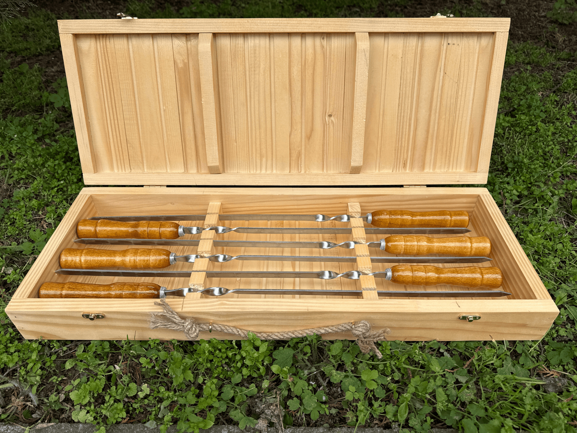 Подарочный набор шампуров для шашлыка с деревянной ручкой в деревянном кейсе,комплект из 6 штук-длиной 62,7 см