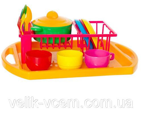 Пластиковий набір посуду "Юна господиня" з 19 елементів. У комплекті: таця, підставка під посуд, каструлька з кришкою, чашки, блюдця, столові прилади (ножі, ложки, виделки).