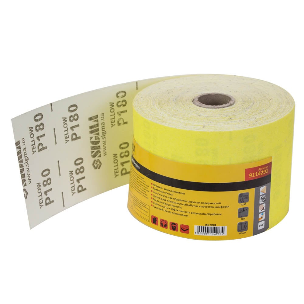 Шліфувальний папір рулон 115ммх50м P180 Sigma (9114291) призначений для ручної та машинної обробки поверхонь різних матеріалів (метал, дерево, скло, пластик) - видалення старої фарби, підготовки поверхні для ґрунтування та фарбування, шліфування пофарбованих поверхонь та пр. Оптимальна для обробки тонких кромок, шліфування та вирівнювання ґрунтувальної шпаклівки.
