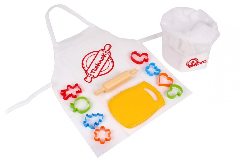 В наборе от ТехноК есть все необходимое для первых кондитерских шедевров: 8 цветных формочек, дощечка и скалка. Можно вырезать пирожные различной формы, выбрав что Вам нравится. С такой игрушкой Ваш малыш почувствует себя профессиональным шеф-поваром, поскольку в наборе есть белый фартук с ярким рисунком и настоящий поварской колпак. На помощь маме добавляем рецепт вкусной выпечки. Пирожные с шоколадом, орешками или изюмом - решать это только маленьком шефу! Все элементы изготовлены из качественной и безопасной пластмассы, без запаха.