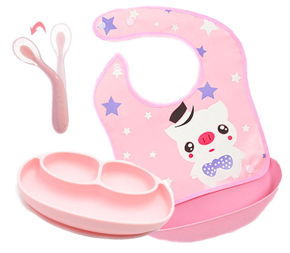 Описание Набір силіконова тарілка килимок, слинявчик ПВХ зі свинкою та силіконова ергономічна ложка (vol-1096)