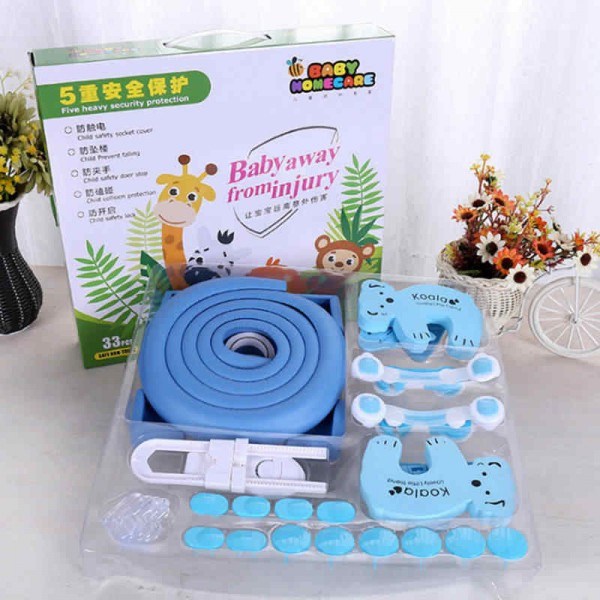 Дитячий комплект безпеки в будинку складається з 33 предметів. Тут ви зможете знайти: захисну стрічку для кутів столу, накладки на кут, дверні стопори, замки на меблі та інші товари, які ви зможете побачити на фото вище.