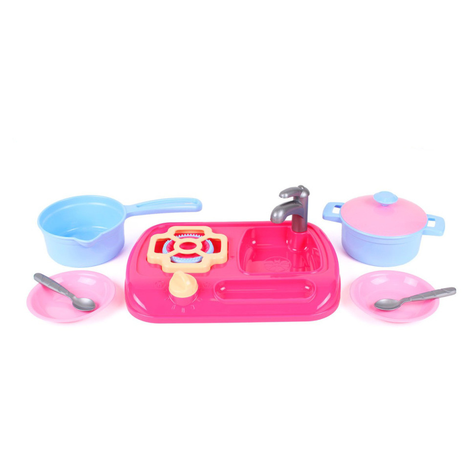 В новой кухне есть все самое необходимое для маленьких поваров. На поверхности с газовой конфоркой можно приготовить вкусные блюда для игрушечных друзей. Для этого в наборе есть большая кастрюля с крышкой, сотейник, тарелки, ложки и вилки. А после праздничного обеда надо помыть посуду. Это можно сделать в игрушечной мойке с краном и подвижной ручкой. Игрушечная кухня с набором посуды - является прекрасным подарком для всех детей. С такой игрушкой маленькие повара могут играть на настоящей кухне и помогать маме. Такие игры хорошо развивают моторику и детское воображение. Набор продается в яркой коробке с ручкой, за которую его удобно переносить. В наборе: столешница кухонная, кран, кастрюля, сотейник, крышка, ложки, вилки и тарелки по 2 шт. Игрушка для детей от 3-х лет. Размер упаковки: 33х23х10,5 см.