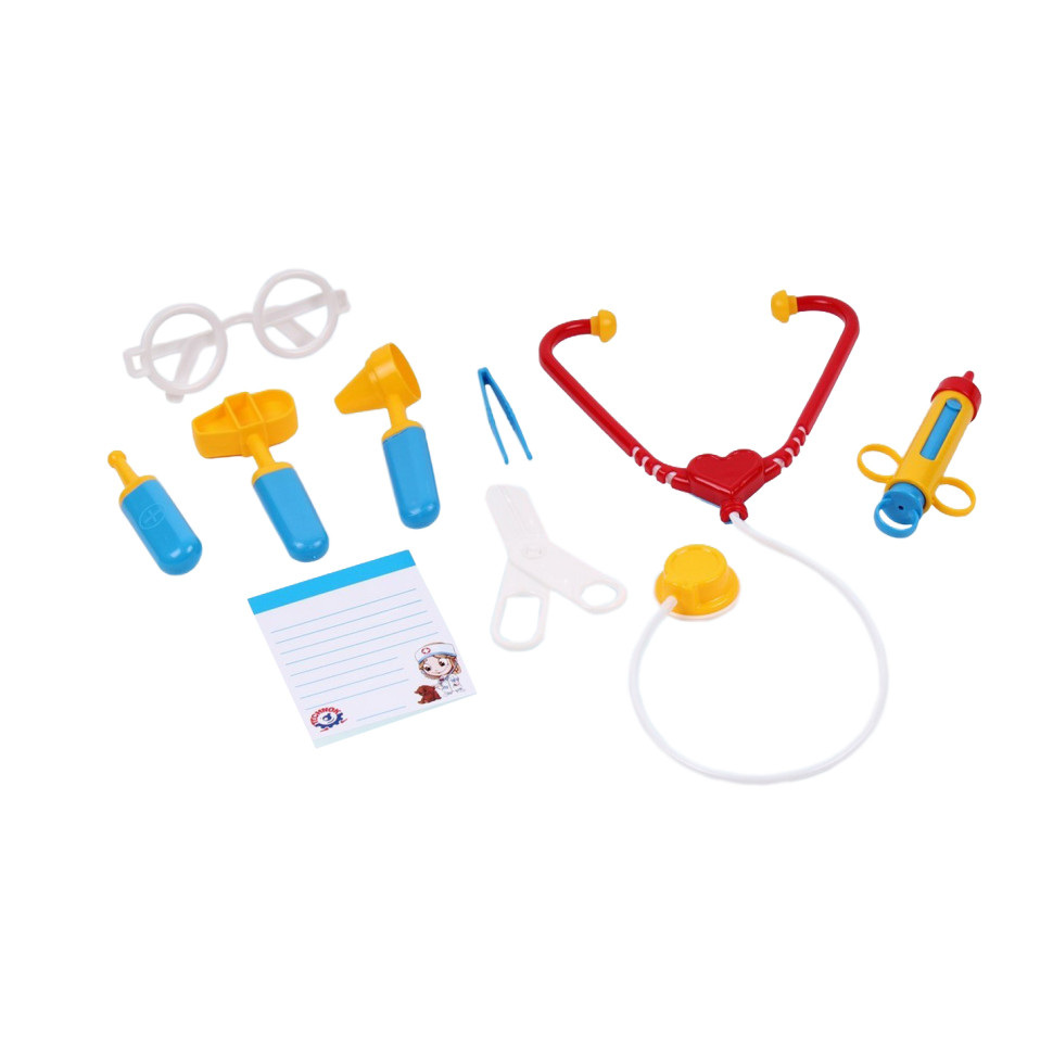 Психологи утверждают, что дети, которые играют у врача, гораздо спокойнее ведут себя в кабинете настоящего врача. В комплекте - 9 наиболее популярных инструментов: стетоскоп, шприц, термометр, очки, пинцет, молоток, отоскоп, ножницы, бланк рецепта. Имея такой набор инструментов малыш несомненно «вылечит» своего любимого медвежонка от любой болезни.
