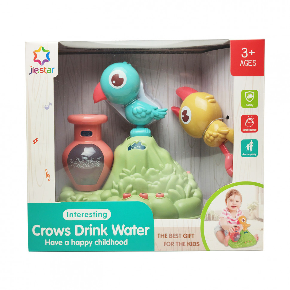 Дуже цікава розвиваюча іграшка для найменших. Вона оснащена світловими і звуковими ефектами. Вона виконує 10 різних звуків, 5 веселих мелодій при звучанні яких рухається пташка зображуючи процес пиття води, а також видає 3 звучання музичних інструментів. Також в набір входить пташка мама яка приносить для своєї малечі камінчики які потрібно помістити в кувшігну. Для видалення каменів з іграшки присутній віконце ззаду іграшки. Розмір іграшки: 21 х 12,5 х 21,5 см. Розмір упаковки: 26 х 13,5 х 30 см. Упаковка: коробка.