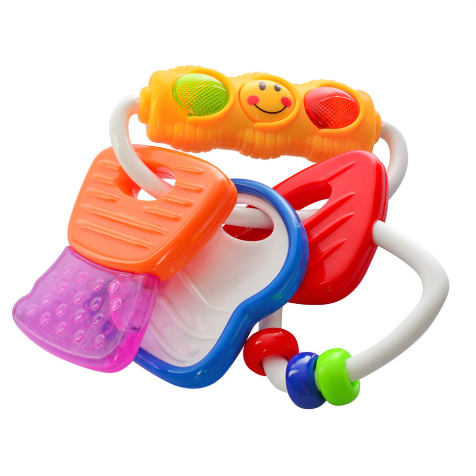 Брязкальце-прорізувач. Ключики відмінно підходять для маленьких ручок. Опуклі орнаменти на ключах дають різні тактильні відчуття, і допомагають малюкові впоратися з періодом появи перших зубів. При натисканні на усміхнену мордочку блимають вогники. Різнобарвні колечка зручно обертати, розвиваючи дрібну моторику рук. Особливості: масажує ясна світлові ефекти розвиває сприйняття кольору розвиває тактильні відчуття Елементи живлення: 3 батарейки типу AG13 1.5V (входять в комплект)