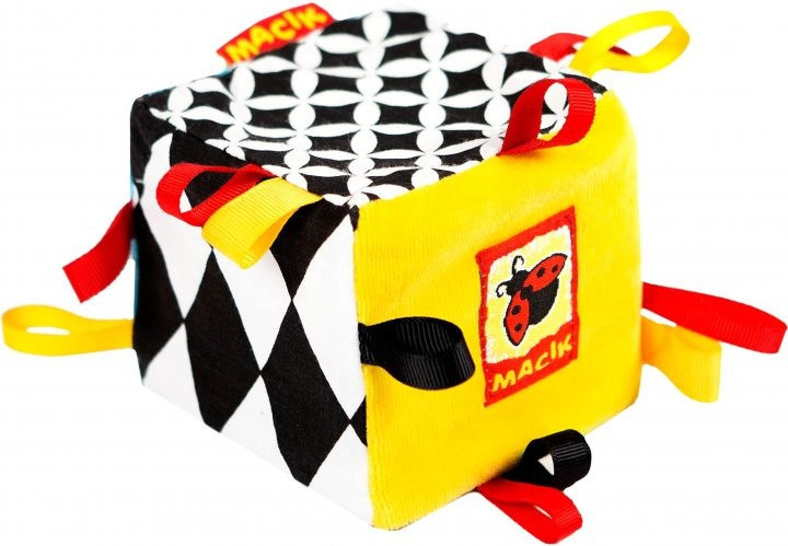 Кубик-іграшка серії Black andamp; White TM Macik пошитий з натуральних, різнофактурних тканин. Його контрастні зображення, лінії і фігури неодмінно зацікавлять малюка, адже їх так цікаво вивчати. Шелесткі деталі і брязкальце усередині подарують посмішку і радість. Різнобарвні петельки малюк буде з інтересом перебирати крихітними пальчиками. Дуже важливо, що ці деталі допоможуть малюкові в формуванні зору і розвитку слуху, сенсорики та дрібної моторики рук. Кубик м'який і абсолютно безпечний для малюка! Іграшка прекрасно переносить делікатне прання і швидко сохне. Склад: бавовняна тканина; різнофактурні матеріали; шийна фурнітура; звукові елементи; поролон. Розмір: 8 × 8 × 8 см.