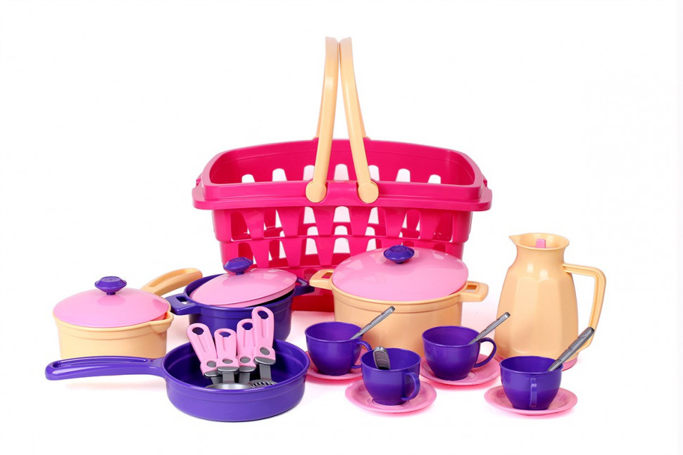 Особливістю цього набору є великий зручний кошик, в який запаковані каструлі, кавник і інші кухонне приладдя. Набір виконаний в яскравій сучасній кольоровій гамі. Розміри посуду - діаметр дна великої каструлі 140 мм, сотейника - 120 мм. Всього в комплекті - 26 елементів, серед яких крім 2-х каструль різної висоти ще сковорідка, сотейник, три кришки до них, а також черпак, шумівка, велика кухарська виделка і лопатка, кавник, чашки з блюдцями і ложками. Розмір упаковки: 34х27х17 см.
