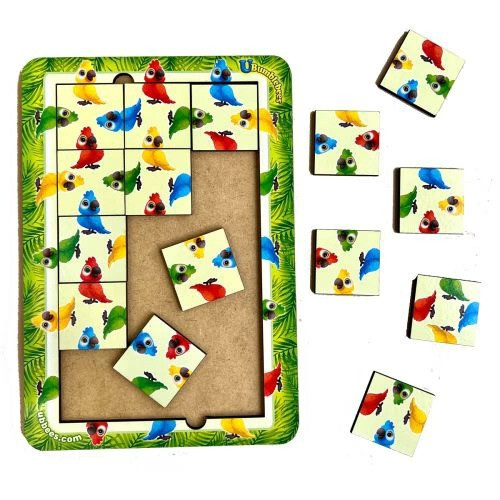 Деталі у вигляді квадратів. Потрібно зібрати пазл з усіх квадратів, на яких намальовані частини різнокольорових папуг. Можна також рахувати папуг та вивчати кольори і напрямки. 1. Розвиток логічного і понятійного мислення. 2. За допомогою такого методичного матеріалу діти пізнають навколишній світ. 3. Розвивається дрібна моторика. Дістаючи і вставляючи певним чином деталі сортера, діти прекрасно тренують пальчики. 4. Працює зорова пам'ять, тренується увага і посидючість.