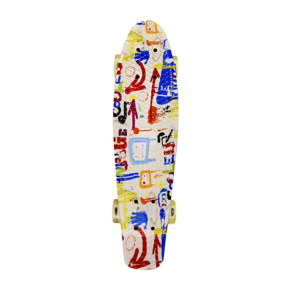 Пенні борд з колесами, що світяться - це легкий і компактний скейтборд, який відрізняється яскравим та веселим дизайном. Цей скейтборд має невеликий розмір та вагу, що робить його ідеальним для коротких поїздок по місту або круїзів на березі моря. Одна з найбільш вражаючих особливостей пенні борду з колесами, що світяться, це його колеса, які оснащені LED-підсвічуванням. При кожному русі колеса починають світитися, створюючи яскраву та незабутню картинку на дорозі. Цей скейтборд також відрізняється високою міцністю та довговічністю. Виготовлений з якісних матеріалів, він може витримувати великі навантаження та не піддається швидкому зношенню. Крім того, пенні борд з колесами, що світяться, легко керується та має хорошу маневреність, що робить його ідеальним для початківців та досвідчених скейтбордистів.