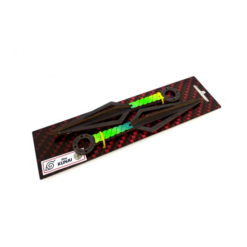 Дерев'яний виріб у вигляді японського ножа "Кунай". Зроблений дуже якісно, з високою деталізацією та яскравим забарвленням. У наборі два такі ножі. Розмір: 21 х 3 х 5 см. Упаковка: планшет Розмір упаковки: 7,5 х 3,5 х 28 см