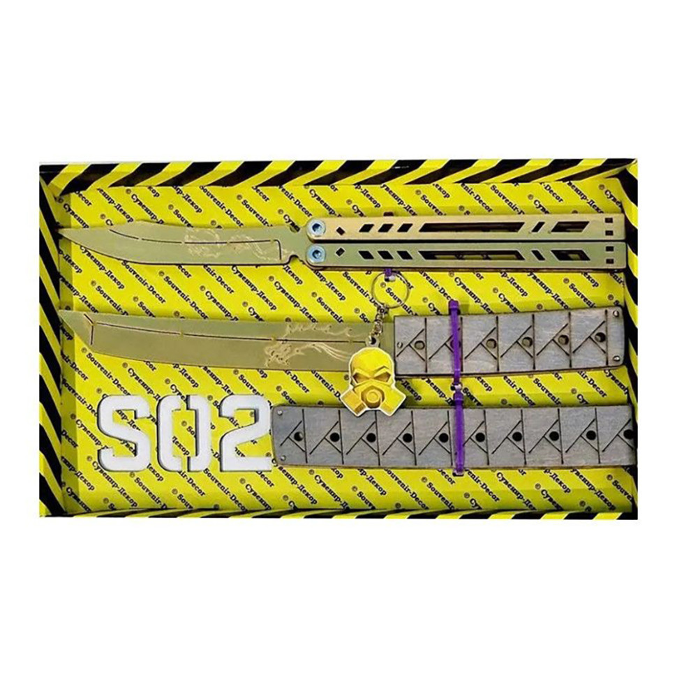 Набір сувенірних ножів - метелик і Tanto якудза. Матеріал: фанера. Довжина ножа - 26.5 см, і 28 см. Чудовий подарунок-сувенір, у комплекті є брелок. Ножі дерев'яні, якісні та міцні. Не заточені, гострі частини закруглені та зашліфовані, повністю безпечні. Для дітей від 6 років.
