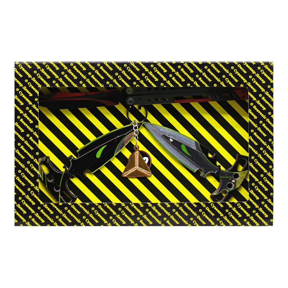Набір сувенірних ножів - ніж-метелик і 2 тичкових ножі. У комплекті також є брелок у подарунок. Матеріал: фанера. Довжина ножа-метелика - 28 см, довжина тичкових ножів - 13 см. Чудовий подарунок-сувенір. Ножі дерев'яні, якісні та міцні. Не заточені, гострі частини закруглені та зашліфовані, повністю безпечні. Для дітей від 6 років.