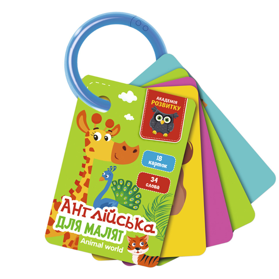 Картки на кільці "Англійська для малят. Animal world". Особливості: знімне кільце, яскраві зображення. Комплектація: 18 карток, знімне кільце. Мова: англійська Вік: 3-6 років.