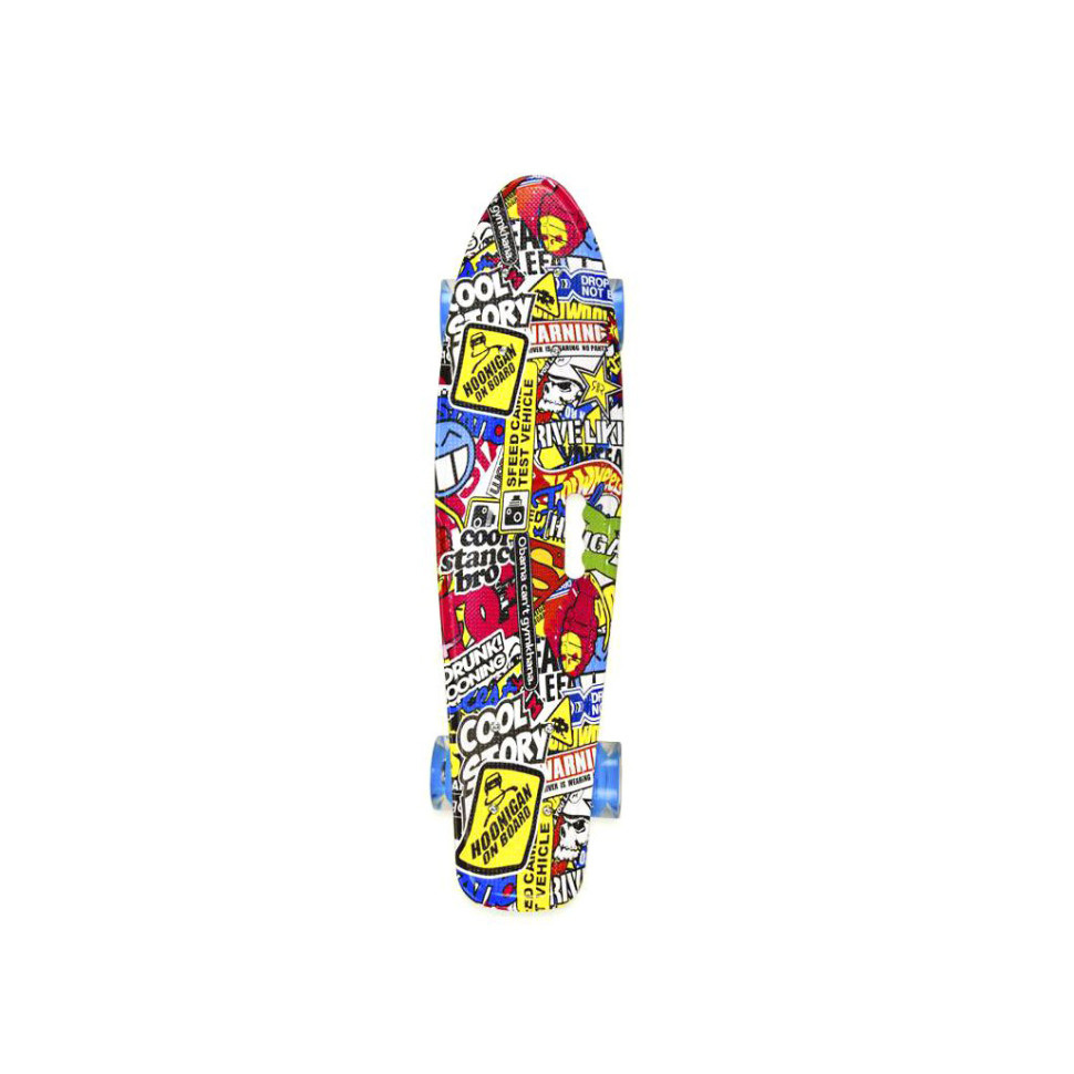 Пенні Борд. Легка дека зроблена з міцного формованого пластика. Довжина деки - 55 см., Ширина - 15 см. Принт завдано на деку з одного боку. Колеса PU, d = 6 см. Максимальне навантаження 70 кг. Колеса зі світлом