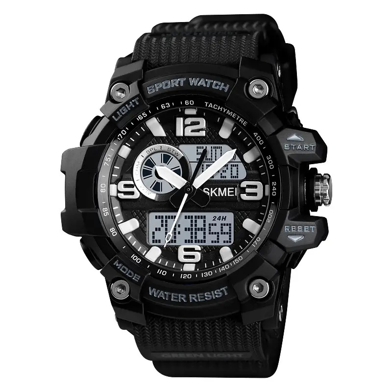 Втілення істинно чоловічого, брутального дизайну наручного спортивного годинника, аналогово-цифровий хронометр Skmei 1436 поза конкуренцією! Рубані, різкі форми корпусу, декор у вигляді металевих «болтів» - хто наважиться кинути виклик цьому втіленню чоловічої войовничої природи?