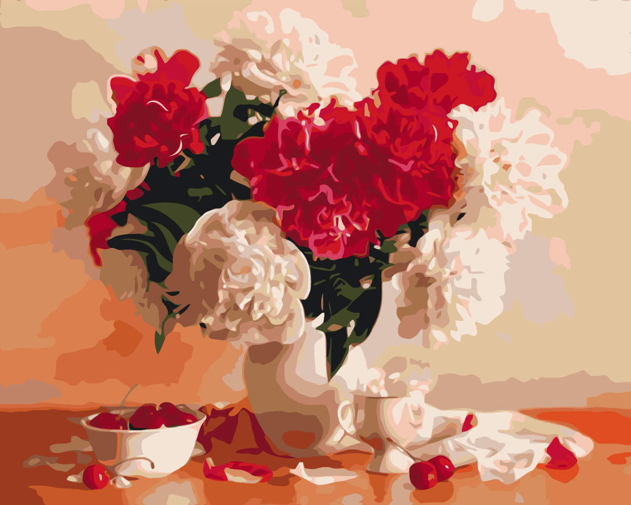 Описание Картина за номерами BrushMe "Червоно-білі півонії та вишні" 40х50см BS8082