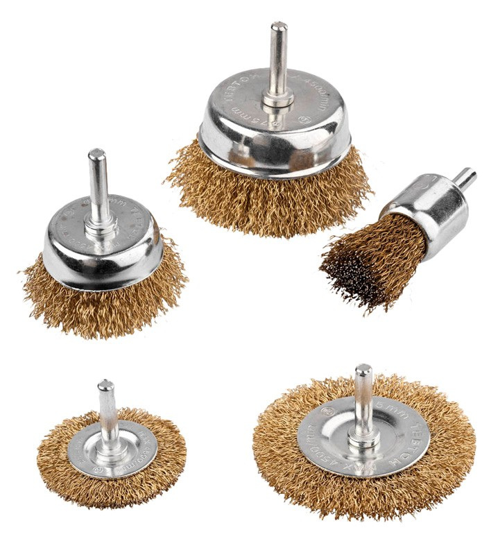 Щітки із латунованого рифленого дроту зі стрижнем 5 шт (торц. 25/50/75 мм, диск. 50/75 мм) MASTERTOOL GM (19-9501)