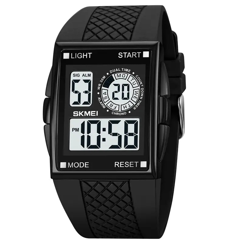 Лаконічний наручний годинник SKMEI 1967 виглядає стильно і не містить жодних зайвих елементів у дизайні: чорний циферблат обрамлений чорним корпусом, що переходить у чорний ремінець з поліуретану. Виділяється лише незвичайна організація елементів на циферблаті: секунди відображаються в окремому вікні, а дата з днем тижня розміщена разом у правому верхньому кутку. Розширений функціонал вносить ще більше можливостей застосування цього аксесуара у повсякденному житті. Крім часу, у них вбудований будильник, секундомір та таймер. Для зручності налаштування та використання з боків корпусу розташовано чотири кнопки різного призначення. Рівень захисту від потрапляння вологи та пилу підтверджено стандартом 3 АТМ, що запобігає пошкодженню механізму при попаданні крапель води на корпус та дозволяє користуватися аксесуаром не побоюючись за його збереження.