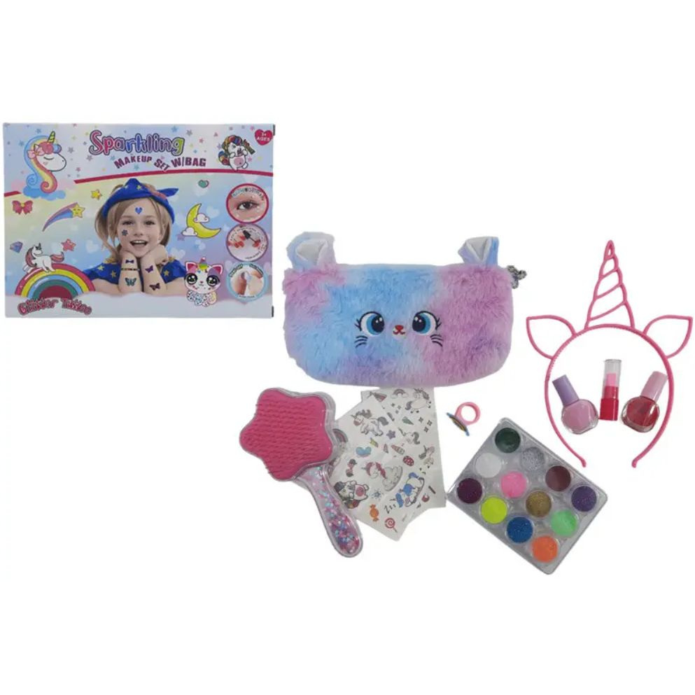 Набір з дитячою косметикою та аксесуарами сподобається юній принцесі. З допомогою даного набору дитина розвиватиме креативність та творче мислення. У комплекті є: пухнаста косметичка з мордочкою тваринки; тату-перебивки, набір сипучих різнокольорових блискіток (12 кольорів), лак для нігтів (2 кольори), помада (муляж), гребінець та прикраси (обідок, перстень). Виготовлено все з якісних та безпечних матеріалів. Для дітей старше трьох років.