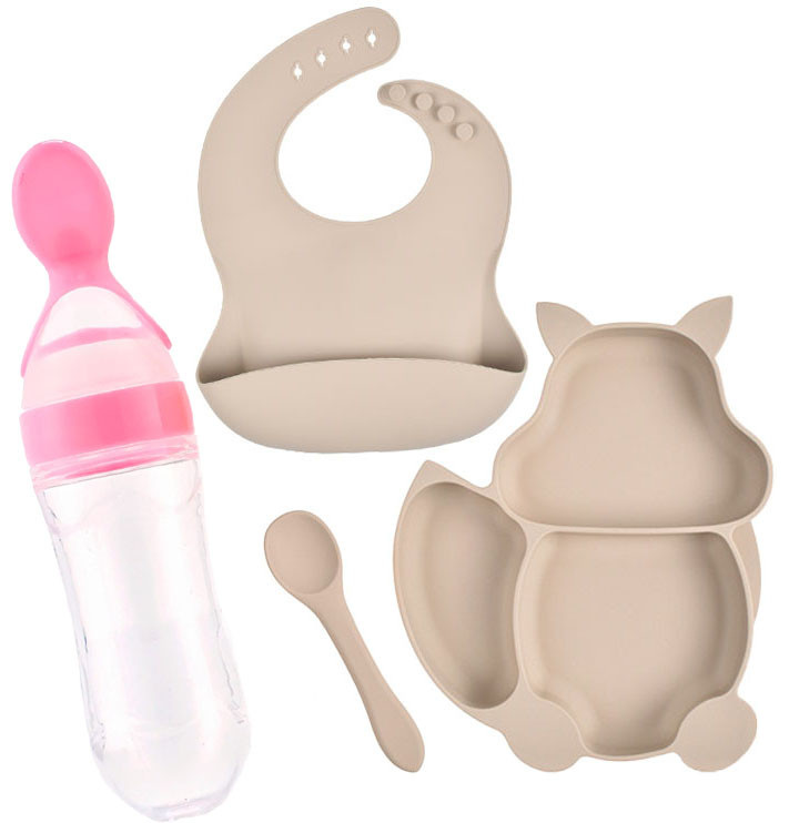 Набір силіконового посуду, розроблений і створений з урахуванням всіх вимог мам для годування дітей від 1 місця до 5 років, складається з 5 предметів: Три-секційна силіконова тарілка у формі білки Силіконовий слинявчик з регульованою застібкою та кишенею Ложка та переваг перед іншими видами дитячого посуду: 1.Посуд з харчового силікону не б'ється і не має запаху 2. Представлений набір посуду має потрібні вигини для зручності при експлуатації 3.Посуд виготовлений з харчового силікону відповідає всім міжнародним стандартам якості 4.Посуд можна стерилізувати та мити в посудомийній машині 5.Силіконовий посуд можна використовувати в духовці, в пароварці або в НВЧ 6.Силіконова тарілка: секційна у формі білки має присоску, що забезпечує стійкість посуду на столику для годування або на будь-якій іншій гладкій і чистій поверхні. 7.Весь посуд зберігає свій первісний вигляд протягом усього терміну експлуатації. Секційна силіконова тарілка у формі білочки із трьох секцій на присосці. У ній можна готувати їжу для дитини, поєднувати різні види продуктів за консистенцією та температурою. Тарілка має присоску на дні і не ковзає по поверхні столика, - це особливо зручно коли малюк захоче вчитися їсти самостійно, але також є виступ, що легко відчепити липучку. Особливість цієї тарілочки, її форма, - білочка обов'язково зацікавить вашого малюка. Слюнявчик - незамінна річ під час годування малюка. Максимум комфорту для дитини та мінімум прибирання для мами. Компактний та зручний у використанні для дому, дитячого садка, поїздок, прогулянок. Не потребує прання. Нагрудник достатньо протерти ганчіркою або серветкою. Кишенька для уловлювання пролитої їжі відмінно захищає одяг від забруднень. Набір столових приладів із харчового силікону це ідеальні: виделка та ложечка для початку прикорму. Зручні та акуратні ложечка і вилочка з даного набору не пошкодять ніжні ясна, що ще не зміцніли, і перші зубики малюка навіть при натисканні на столові предмети. Особлива форма та невеликий обсяг необхідні для плавного переходу малюка від грудей до ложки. Ложка – контейнер для годування новонародженого (пюре, каша, суп). Об'єм 90 мл. Відмінна заміна звичайної пляшки. Нова ложка - контейнер зручний спосіб привчити малюка їсти з ложечки. Здавлюючи м'який силіконовий контейнер, вміст пляшечки потрапляє через проріз у ложку в достатній для дитини кількості. Відпускаючи – пюре або каша мимоволі всмоктується назад у контейнер. Так само ложка – контейнер буде актуальна у дорозі чи під час прогулянки. Контейнер із безпечного силікону, ложечка пластмасова, легко миється. Наша рекомендація: перед використанням промити теплою водою з додаванням нейтрального миючого засобу. Про різницю у кольорі: Всі товари зроблені на натуральних фотографіях. Через різні монітори та освітлення під час зйомки, факторів навколишнього середовища тощо, є невелика різниця в кольорі, яка об'єктивна і її не можна уникнути! Хроматична аберація не є проблемою якості.