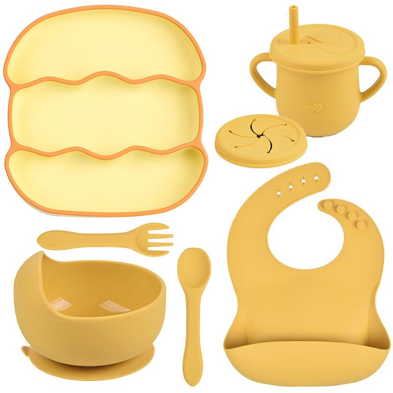 Набір силіконового посуду, розроблений і створений з урахуванням всіх вимог мам для годування дітей, складається з предметів: 1. Трисекційна силіконова тарілка 2. Кругла тарілка на присосці для перших страв 3. Силіконовий слюнявчик з регульованою застібкою та кишенею 4. Вилка 5. Ложка 6. Поильник-непроливайка 7. Змінна кришка-снечниця Набір посуду з силікону має ряд переваг та переваг перед іншими видами дитячого посуду: 1.Посуд з харчового силікону не б'ється і не має запаху 2. Представлений набір посуду має потрібні вигини для зручності при експлуатації 3.Посуд виготовлений з харчового силікону і відповідає всім міжнародним стандартам якості 4.Посуд можна стерилізувати і мити в посудомийній машині 5.Силиконовий посуд можна використовувати в духовці, в пароварці або в НВЧ 6.Силіконові тарілки: секційна та кругла постачання забезпечує стійкість посуду на столику для годування або на будь-якій іншій гладкій та чистій поверхні. 7.Весь посуд зберігає свій первісний вигляд протягом усього терміну експлуатації. Секційна силіконова тарілка із трьох секцій на присосці. У ній можна готувати їжу для дитини, поєднувати різні види продуктів за консистенцією та температурою. Тарілка забезпечена присоскою на дні і не ковзає по поверхні столика - це особливо зручно коли малюк захоче вчитися їсти самостійно, але також є виступ, що легко відчепити липучку. Тарілочка кругла силіконова на присосці, її достатньо, як для початку першого прикорму так і для подальшого годування дитини. Слюнявчик - незамінна річ під час годування малюка. Максимум комфорту для дитини та мінімум прибирання для мами. Компактний та зручний у використанні для дому, дитячого садка, поїздок, прогулянок. Не потребує прання. Нагрудник достатньо протерти ганчіркою або серветкою. Кишенька для уловлювання пролитої їжі відмінно захищає одяг від забруднень. Набір столових приладів із харчового силікону це ідеальні вилочка та ложечка для початку прикорму. Зручні та акуратні ложечка і вилочка з даного набору не пошкодять ніжні ясна, що ще не зміцніли, і перші зубики малюка навіть при натисканні на столові предмети. Особлива форма та невеликий обсяг необхідні для плавного переходу малюка від грудей до ложки. Силіконовий поїльник для дітей 3в1 чашка силіконова з ручками, снечниця, поїльник з трубочкою. Цей поильник можна видозмінити завдяки спеціальним кришкам: це може бути Навчальний поїльник, потім коли малюк підросте, він може бути Снек-стаканчиком - це як непроливайка для напоїв, тільки непросипання для печінок, ягід, фруктів та багато іншого. А коли малюк навчиться пити та їсти самостійно поїльник стане Універсальною чашкою для різних напоїв. Наша рекомендація: перед використанням промити теплою водою з додаванням нейтрального миючого засобу. Про різницю у кольорі: Всі товари зроблені на натуральних фотографіях. Через різні монітори та освітлення під час зйомки, факторів навколишнього середовища тощо, є невелика різниця в кольорі, яка об'єктивна і її не можна уникнути! Хроматична аберація не є проблемою якості.