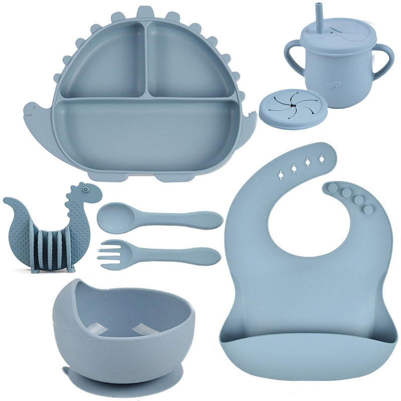 Набір силіконового посуду, розроблений і створений з урахуванням усіх вимог мам для годування дітей, складається з: 1. Трисекційна силіконова тарілка 2. Кругла тарілка на присосці для перших страв 3. Силіконовий слюнявчик з регульованою застібкою та кишенею 4. Виделка 5. 6. Поильник-непроливайка 7. Змінна кришка-снечниця 8. Прорізувач для зубів Набір посуду з силікону має низку переваг та переваг перед іншими видами дитячого посуду: 1. Посуд з харчового силікону не б'ється і не має запаху 2. Представлений набір посуду має потрібні вигини для зручності при експлуатації 3. Посуд виготовлений з харчового силікону і відповідає всім міжнародним стандартам якості 4. Посуд можна стерилізувати і мити в посудомийній машині 5. Силиконовий посуд можна використовувати в духовці, в пароварці або в НВЧ 6. Силіконові тарілки: секційна забезпечені присосками, що забезпечує стійкість посуду на столику для годування або на будь-якій іншій гладкій та чистій поверхні. 7. Весь посуд зберігає свій первісний вигляд протягом усього терміну експлуатації. Секційна силіконова тарілка із трьох секцій на присосці. У ній можна готувати їжу для дитини, поєднувати різні види продуктів за консистенцією та температурою. Тарілка забезпечена присоскою на дні і не ковзає по поверхні столика - це особливо зручно коли малюк захоче вчитися їсти самостійно, але також є виступ, що легко відчепити липучку. Тарілочка кругла силіконова на присосці, її достатньо, як для початку першого прикорму так і для подальшого годування дитини. Слюнявчик - незамінна річ під час годування малюка. Максимум комфорту для дитини та мінімум прибирання для мами. Компактний та зручний у використанні для дому, дитячого садка, поїздок, прогулянок. Не потребує прання. Нагрудник достатньо протерти ганчіркою або серветкою. Кишенька для уловлювання пролитої їжі відмінно захищає одяг від забруднень. Набір столових приладів із харчового силікону це ідеальні вилочка та ложечка для початку прикорму. Зручні та акуратні ложечка і вилочка з даного набору не пошкодять ніжні ясна, що ще не зміцніли, і перші зубики малюка навіть при натисканні на столові предмети. Особлива форма та невеликий обсяг необхідні для плавного переходу малюка від грудей до ложки. Силіконовий поїльник для дітей 3в1 чашка силіконова з ручками, снечниця, поїльник з трубочкою. Цей поильник можна видозмінити завдяки спеціальним кришкам: це може бути Навчальний поїльник, потім коли малюк підросте, він може бути Снек-стаканчиком - це як непроливайка для напоїв, тільки непросипання для печінок, ягід, фруктів та багато іншого. А коли малюк навчиться пити та їсти самостійно поїльник стане Універсальною чашкою для різних напоїв. Виріб виготовлений зі 100% харчового силікону і придатний як для гарячих так і для холодних напоїв. Силіконовий прорізувач для зубів у вигляді динозавра - це функціональний та милий аксесуар, створений спеціально для полегшення неприємних відчуттів, що пов'язує з прорізуванням зубів у вашого малюка. Прорізувач оснащений текстурною поверхнею, яка допомагає масажувати та пом'якшувати ясна дитини під час прорізування зубів. Різні елементи дизайну створюють різні зони для жування, що може полегшити біль та увагу під час прорізування зубів. Силіконовий прорізувач у вигляді динозавра не тільки допомагає зняти дискомфорт 
