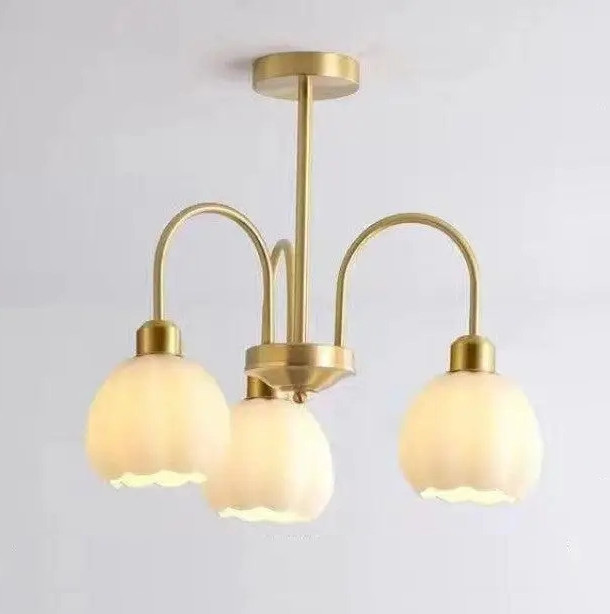 Світлодіодна люстра Тюльпан 5000 складається з центральної металевої основи золотистого кольору, від якої радіально відходять плавні вигнуті руки. На кінцях кожної руки розташовані світильники з матових скляних абажурів м'якого білого кольору з затишним відтінком. Абажури мають форму, що нагадує цибулини або тюльпана, що надають дизайну нотки вінтажу та класики.