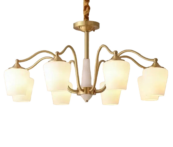 Світлодіодна люстра Дзвіночок 6036 - це сучасна люстра з металевою конструкцією, покритою золотом та білими скляними абажурами. Дизайн елегантний та сучасний, має центральну штангу, що гілкується на граціозно вигнуті руки, кожна з яких підтримує скляний абажур, спрямований вниз. Абажури мають форму дзвона, що допомагає м'яко розсіювати світло. Така люстра підходить для різноманітних інтер'єрів, забезпечуючи як функціональне джерело світла, так і стильний упор у приміщенні.