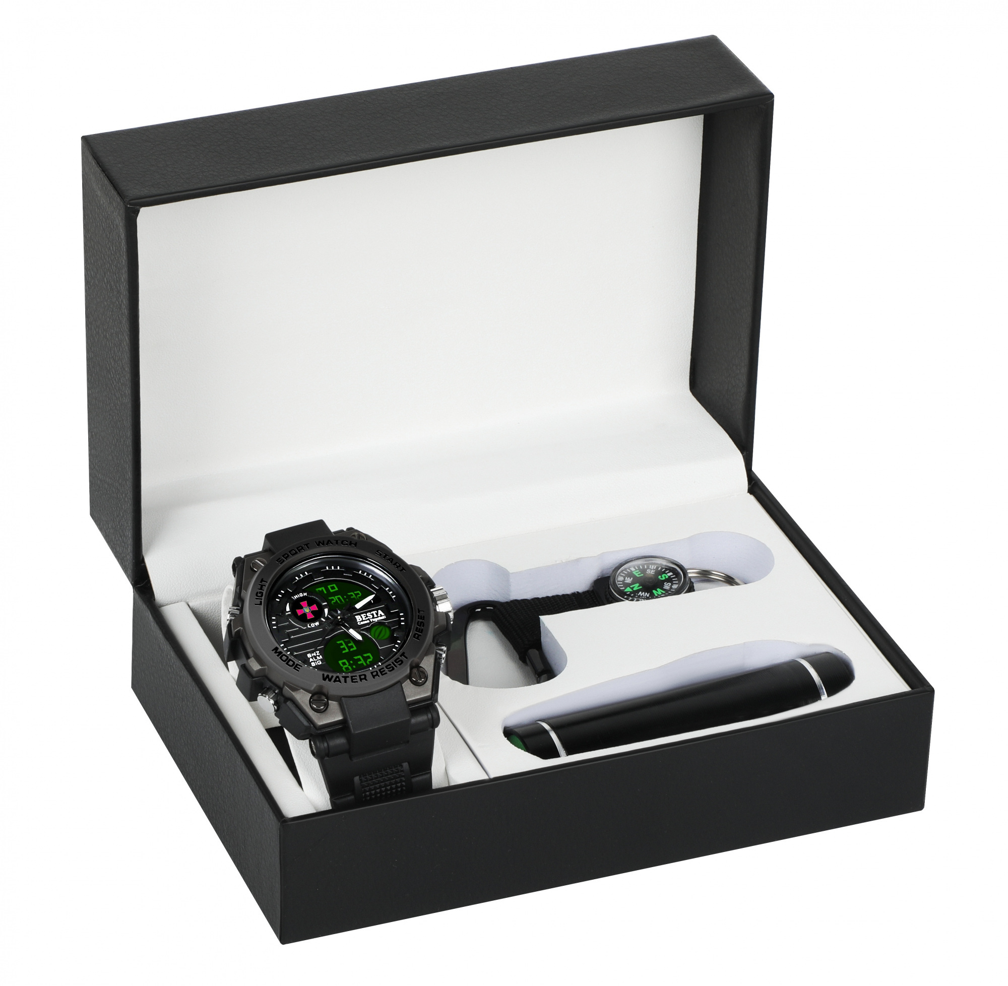 BESTA Box Tattoo ЗСУ Light – унікальний подарунковий набір для себе чи найближчих. Набір складається з тактичних годинників, ліхтарика, застібки з компасом та елегантної фірмової подарункової коробочки. BESTA Tattoo ЗСУ – версія популярної моделі BESTA з гербом ЗСУ. BESTA – це молодий український бренд якісного годинника. Годинник має витончений дизайн та якісний японський механізм. Він розроблений спеціально для військових, витримує підвищене навантаження, холод до -30 та потрапляння води до 3-х метрів. Проектування, розробка та головний офіс бренду знаходяться в Україні, збірка проходить у Китаї, що дозволяє забезпечити кращу ціну за високої якості. На передній стороні годинника виконано витончене гравіювання Слава Україні та логотип ЗСУ! На задній - Героям Слава і тризуб! У комплекті йде офіційна гарантія на 12 місяців.
