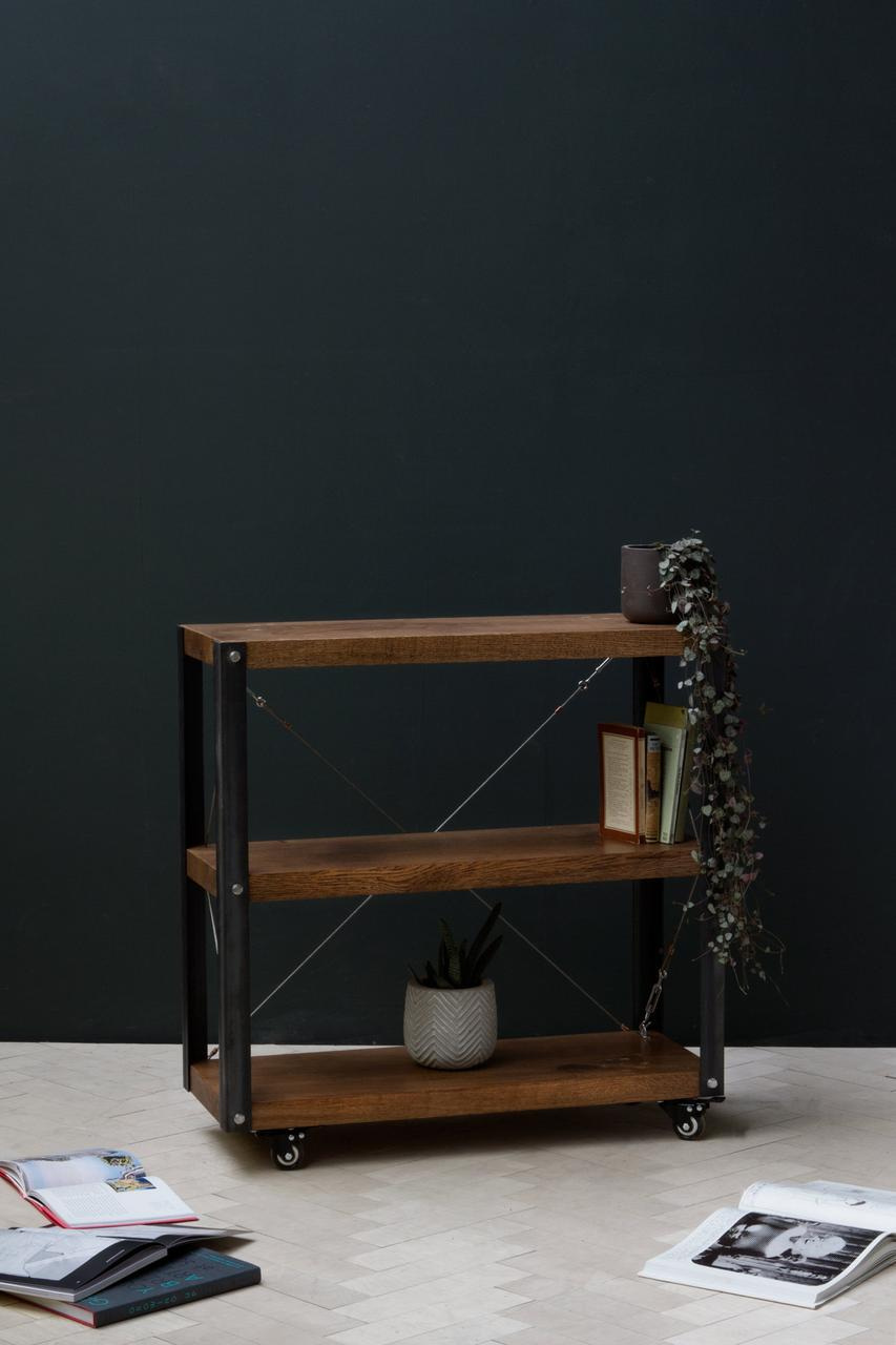 Стеллаж GoodsMetall на колесиках в стиле Лофт 700х700х200 «Регги мини» Стеллаж GoodsMetall на колесиках в стиле Лофт 700х700х200 «Регги мини» – одна из самых стильных и практичных моделей известного производителя дизайнерской мебели. Создателям удалось как по максимуму подчеркнуть брутальность индустриального стиля, так и создать предмет, добавляющий уюта практически любому помещению. Характеристики и особенности модели Для подчеркивания соответствия индустриальному стилю дизайнеры пошли на применение строп-растяжек, не стали прятать от взгляда наблюдателя головки скрепляющих конструкцию винтов. Но в то же время использование массивных деревянных полок, применение дерева неизменно вызывает у человека ощущение тепла и уюта. Дополнительный вклад в создание уютной обстановки вносят небольшие размеры и подвижность стеллажа GoodsMetall на колесиках в стиле Лофт 700х700х200 «Регги мини». Благодаря замене ножек колесиками модель без затруднений оказывается в нужном месте комнаты или всей квартиры, создает дополнительное ощущение удобства и не загромождает пространство. Например, стеллаж удобен для хранения фотоальбомов. В обычные дни его место в гостиной в углу или около стены. Но когда придут гости, небольшой стеллаж буквально одним движением подкатывают к дивану. После чего не приходится ходить к настенным полкам за очередным фотоальбомом.
