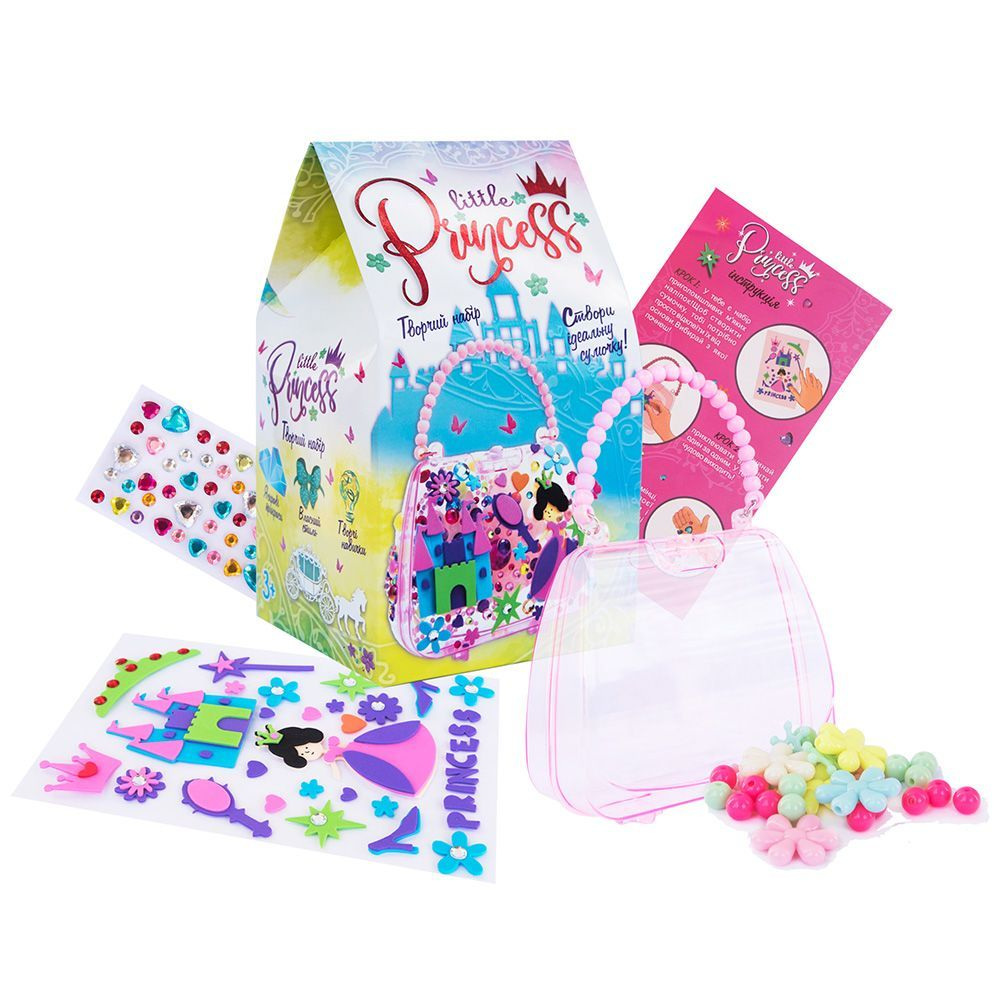 Набор для творчества "Little Princess". При помощи данного набора можно украсит сумочку различными декоративными элементами (наклейки, стразы); а так же, создавать браслетики из бусин. Выполнено из качественных и безопасных материалов.