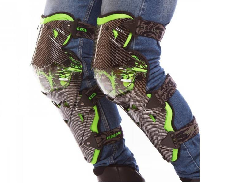 Данные наколенники изготовлены из прочных и износостойких материалов, которые помогают защитить от всевозможных травм при аварии. Наколенники покрывают не только коленную чашечку, но и голень. Не смотря на более жесткую конструкцию из-за шарнирной системы, они хорошо сгибаются в колене не создавая никакого дискомфорта. Внутренняя сторона покрыта мягкой подложкой. На ногу крепятся удобными ремнями на липучках, которые можно регулировать под нужный размер.