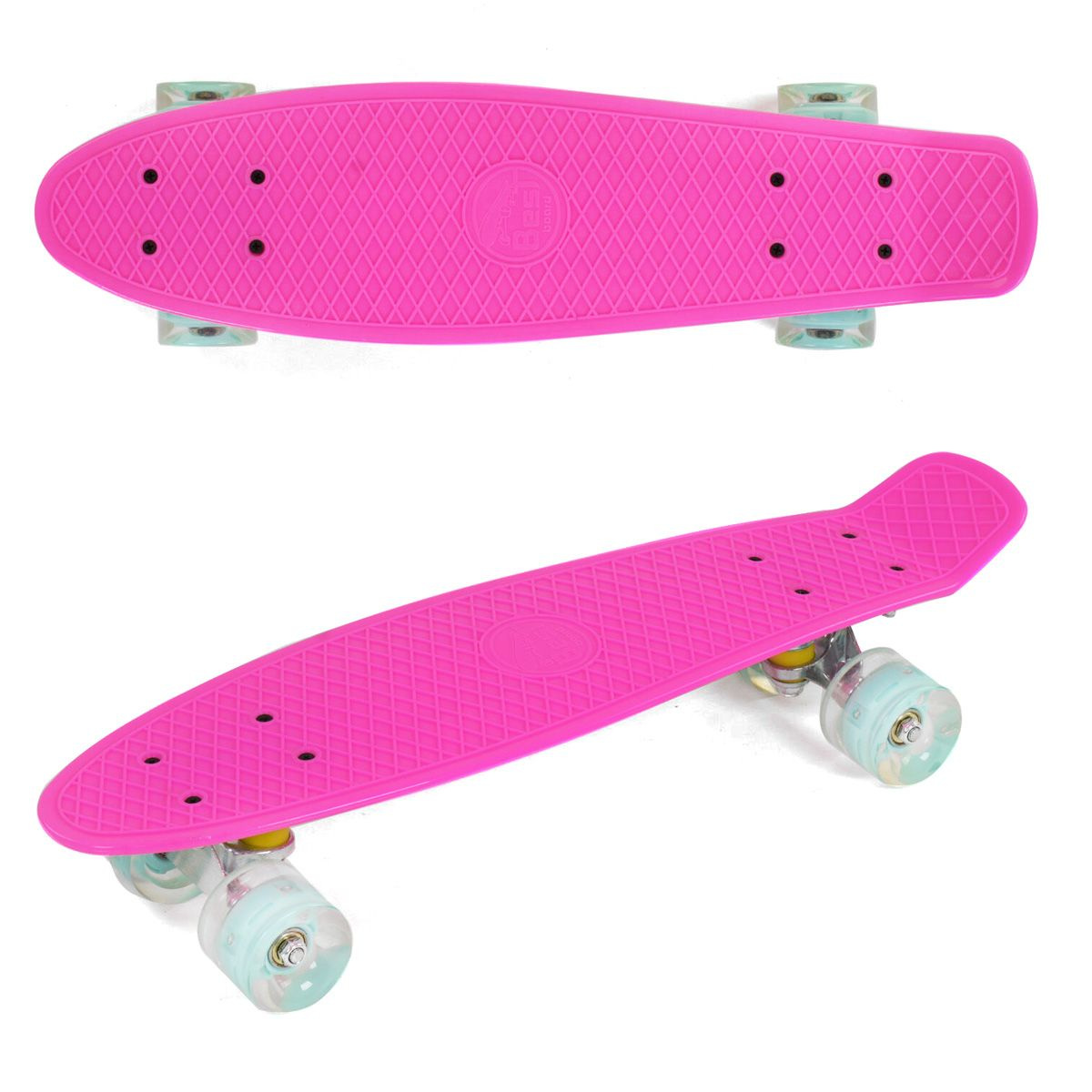 Пенни Борд со светящимися колёсами. Легкая дека сделана из прочного формованного пластика. Имеет противоскользящую поверхность. Длинна деки - 55 см, ширина - 14,5 см. Колёса PU, со светом, d=6 см. Подвески: алюминий. Максимальная нагрузка 70-80 кг.