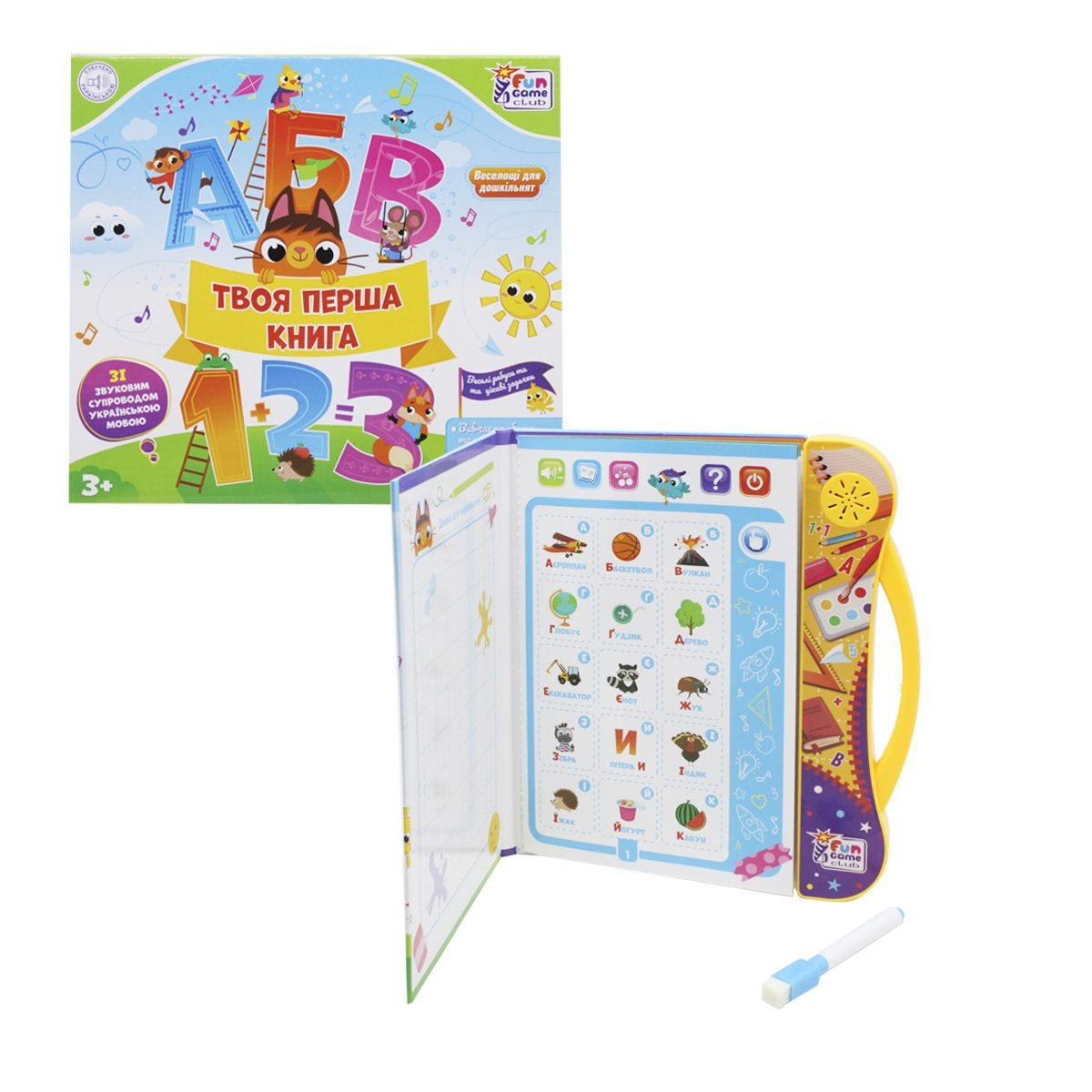 Интерактивная книга для самых маленьких "Моя первая книга" будет прекрасным подарком малышу. Книга поможет выучить алфавит и цифры, ребенок сможет решать интересные ребусы и простые математические задачи. Чтобы активировать сенсорные страницы, нужно нажать на кнопку включения в правом верхнем углу. Далее ребенок может нажимать на буквы, цифры, цвета и слова, чтобы прослушать, как они произносятся. Так же в аудиоформе есть множество сказок, стишков и песенок. В комплекте есть стирающийся маркер, которым можно писать прямо в книжке. Озвучка на украинском языке. Работает от 3-х батареек АА.