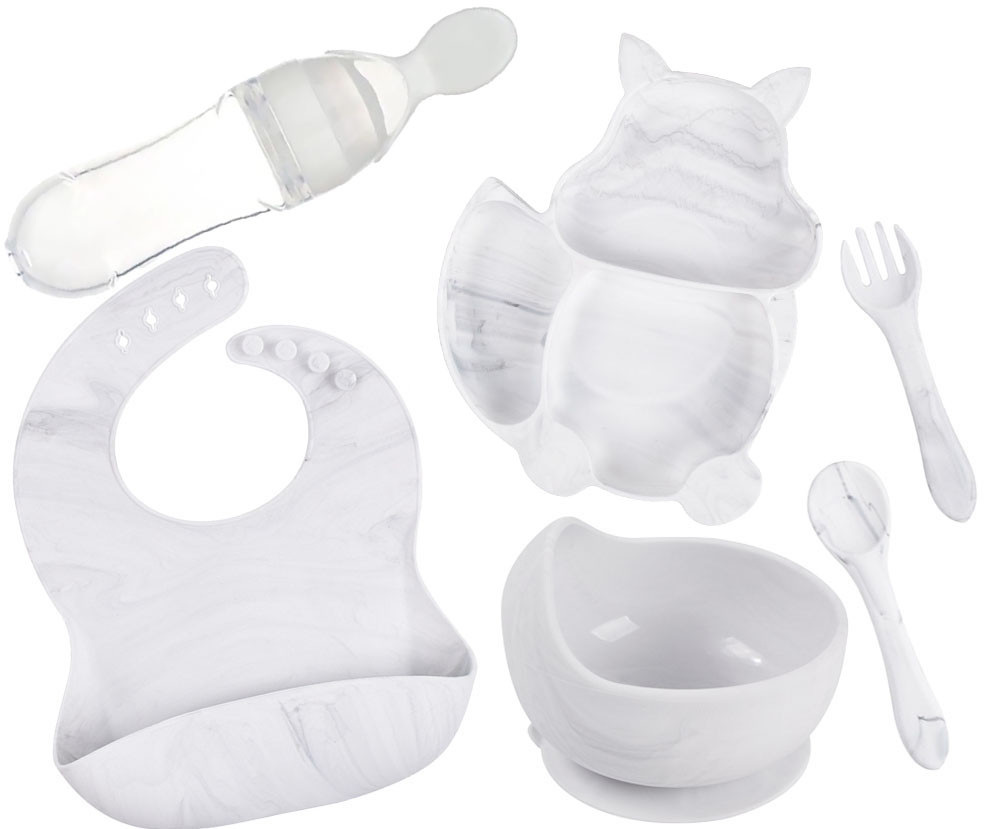 Набор силиконовой посуды, разработан и создан с учётом всех требований мам для кормления детей от 4х месяцев до 5 лет, состоит из 5 предметов: