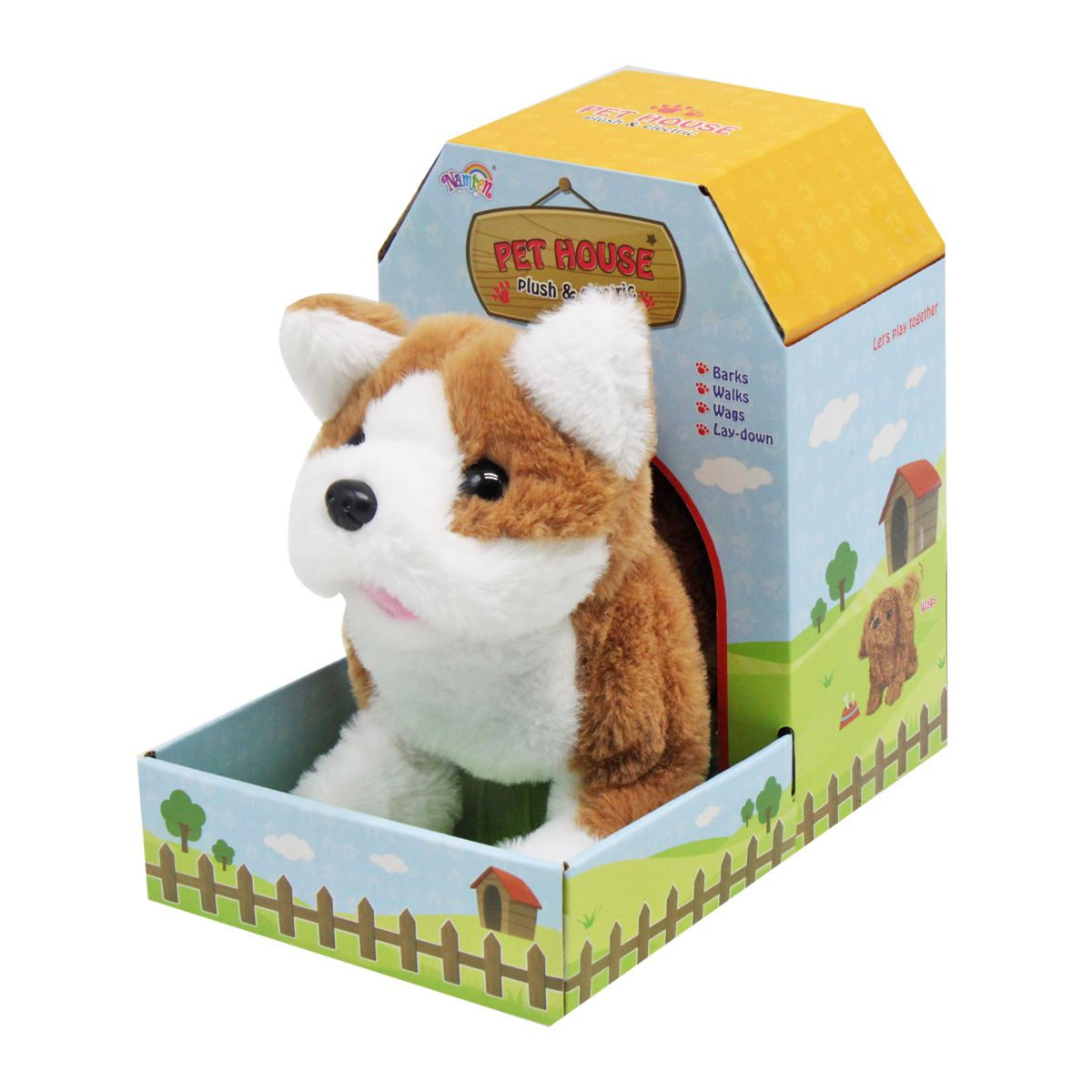 Интерактивная игрушка собачка. Игрушка работает от батареек. Ходит, гавкает и виляет хвостиком. Мягкая и очень приятная на ощупь. Упаковка выполнена в виде будки. Размер игрушки 16х15х10 см.