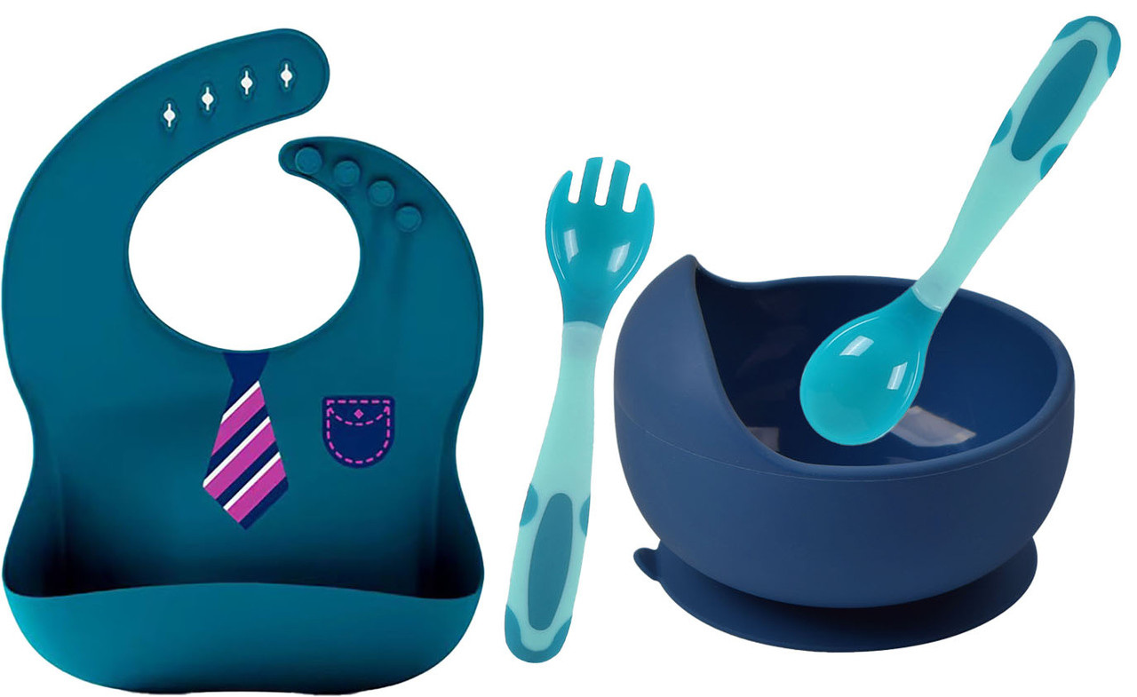 Набор силиконовой посуды, разработан и создан с учётом всех требований мам для кормления детей от 1-го месяца до 5 лет, состоит из 3 предметов: 1.Трёх-секционная силиконовая тарелка 2.Вилка 3.Ложка Набор посуды из силикона обладает рядом преимуществ и достоинств перед другими видами детской посуды: 1.Посуда из пищевого силикона не бьется и не имеет запаха 2. Представленный набор посуды имеет нужные изгибы для удобства при эксплуатации 3.Посуда изготовлена из пищевого силикона соответствует всем международным стандартам качества 4.Посуду можно стерилизовать и мыть в посудомоечной машине 5.Силиконовую посуду можно использовать в духовке, в пароварке или в СВЧ 6.Силиконовая тарелка: секционная снабжена присоской, что обеспечивает устойчивость посуды на столике для кормления или на любой другой гладкой и чистой поверхности. 7.Вся посуда сохраняет свой первоначальный вид в течении всего срока эксплуатации. Тарелочка круглая силиконовая на присоске ее достаточно, как для начала первого прикорма так и для последующего кормления ребёнка. Тарелка снабжена присоской на дне и не скользит по поверхности столика, - это особенно удобно когда малыш захочет учиться кушать самостоятельно, но также есть выступ, что бы легко отцепить липучку. В свою очередь, завышенный бортик тарелки поможет набрать еду маленькими, ещё не умелыми ручками. Термочувствительная ложка/вилка меняющая форму. Ложку или вилку можно изогнуть и она останется в той форме, которую вы ей придадите, это даст возможность быстрее ребенку привыкнуть к новым самостоятельным движениям. Столовые приборы имеют отличительную особенность, - чувствительны к температуре, чтобы избежать ожогов. Когда температура пищи превышает 40 ℃, головка ложки/вилки становится белой, а когда температура ниже 40 ℃, цвет восстанавливается. Также не мало важно, они идут в пластиковом прозрачном футляром для хранения, что очень удобно если необходимо брать с собой в дорогу. Характеристики: Материал: Силикон + пищевой пластик. Легко ухаживать: можно мыть руками или в посудомоечной машине. Длина - 14,4 см (обеспечивает комфортное кормление родителями без проливания, также подходит для всех видов баночек и контейнеров) Толщина ручки (в самом широком месте 3 см) подойдет для любого возраста ребенка. Слюнявчик - незаменимая вещь при кормлении малыша. Максимум комфорта для ребёнка и минимум уборки для родителей. Компактный и удобный в использовании для дома, детского сада, поездок, прогулок. Не требует стирки. Нагрудник достаточно протереть тряпочкой или салфеткой. Кармашек для улавливания пролитой еды отлично защищает одежду от загрязнений. Наша рекомендация: перед использованием промыть теплой водой с добавлением нейтрального моющего средства. О разнице в цвете: Все товары сделаны на натуральных фотографиях. Из-за различных мониторов и освещения при съемке, факторов окружающей среды и т. д., есть небольшая разница в цвете, которая объективна и ее нельзя избежать! Хроматическая аберрация не является проблемой качества.