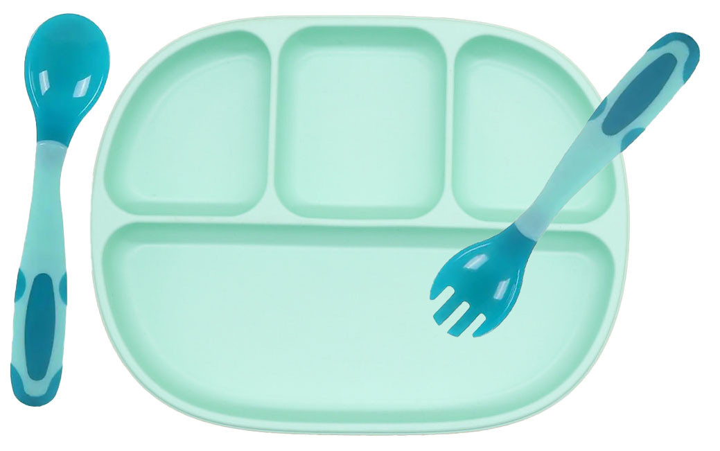 Детская четырех-секционная силиконовая тарелка создана с учётом всех требований мам для кормления детей от 1-го месяца до 5 лет: Посуды из силикона, тарелка, обладает рядом преимуществ и достоинств перед другими видами детской посуды: 1.Тарелка на четыре секций из пищевого силикона не бьется и не имеет запаха 2. Представленная тарелка имеет нужные изгибы для удобства при эксплуатации 3.Тарелка изготовлена из пищевого силикона соответствует всем международным стандартам качества 4.Тарелку можно стерилизовать и мыть в посудомоечной машине 5.Ее также можно использовать в духовке, в пароварке или в СВЧ 6.Силиконовая тарелка: секционная снабжена присоской, что обеспечивает устойчивость посуды на столике для кормления или на любой другой гладкой и чистой поверхности. 7.Она сохраняет свой первоначальный вид в течении всего срока эксплуатации. Секционная силиконовая тарелка с пяти секций на присоске. В ней можно готовить пищу для ребёнка, совмещать разные виды продуктов по консистенции и по температуре. Тарелка снабжена присоской на дне и не скользит по поверхности столика, - это особенно удобно когда малыш захочет учиться кушать самостоятельно, но также есть выступ, что бы легко отцепить липучку. Термочувствительная ложка/вилка меняющая форму Ложку можно изогнуть и она останется в той форме, которую вы ей придадите, это даст возможность быстрее ребенку привыкнуть к новым самостоятельным движениям. Длина ручки 14,4 см — обеспечивает комфортное кормление родителями без проливания, также подходит для всех видов баночек и контейнеров. Характеристики: Материал: Силикон + пищевой пластик. Легко ухаживать: можно мыть руками или в посудомоечной машине. Длина - 14,4 см толщина ручки (в самом широком месте 3 см) Особенности: Если ложку изогнуть, то она останется в изогнутой форме (форме которая Вам нужна). Конструкция, чувствительная к температуре, чтобы избежать ожогов.Когда температура пищи превышает 40 ℃, головка ложки становится белой, а когда температура ниже 40 ℃, цвет восстанавливается. Комплектация - ложка/вилка идет в комплекте с пластиковым прозрачным футляром для ее хранения Наша рекомендация: перед использованием промыть теплой водой с добавлением нейтрального моющего средства. О разнице в цвете: Все товары сделаны на натуральных фотографиях. Из-за различных мониторов и освещения при съемке, факторов окружающей среды и т. д., есть небольшая разница в цвете, которая объективна и ее нельзя избежать! Хроматическая аберрация не является проблемой качества.
