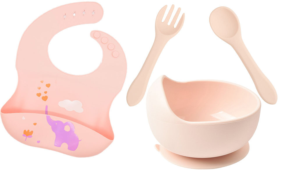 Набор 2Life тарелка для первых блюд Y4, ложка, вилка и силиконовый мягкий слюнявчик слоник Розовый (vol-10301)