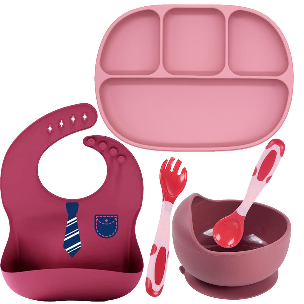 Набор силиконовой посуды, разработан и создан с учётом всех требований мам для кормления детей от 1го месяца до 5 лет, состоит из 5 предметов: 1.Четырех-секционная силиконовая тарелка 2.Вилка 3.Ложка 4.Тарелка для супа 5.Силиконовый слюнявчик Набор посуды из силикона обладает рядом преимуществ и достоинств перед другими видами детской посуды: 1.Посуда из пищевого силикона не бьется и не имеет запаха 2. Представленный набор посуды имеет нужные изгибы для удобства при эксплуатации 3.Посуда изготовлена из пищевого силикона соответсвует всем международным стандартам качества 4.Посуду можно стерилизовать и мыть в посудомоечной машине 5.Силиконовую посуду можно использовать в духовке, в пароварке или в СВЧ 6.Силиконовая тарелка: секционная снабжена присоской, что обеспечивает устойчивость посуды на столике для кормления или на любой другой гладкой и чистой поверхности. 7.Вся посуда сохраняет свой первоначальный вид в течении всего срока эксплуатации. Тарелочка круглая силиконовая на присоске ее достаточно, как для начала первого прикорма так и для последующего кормления ребёнка. Тарелка снабжена присоской на дне и не скользит по поверхности столика, - это особенно удобно когда малыш захочет учиться кушать самостоятельно, но также есть выступ, что бы легко отцепить липучку. В свою очередь, завышенный бортик тарелки поможет набрать еду маленькими, ещё не умелыми ручками. Термочувствительная ложка/вилка меняющая форму. Ложку или вилку можно изогнуть и она останется в той форме, которую вы ей придадите, это даст возможность быстрее ребенку привыкнуть к новым самостоятельным движениям. Столовые приборы имеют отличительную особенность, - чувствительны к температуре, чтобы избежать ожогов. Когда температура пищи превышает 40 ℃, головка ложки/вилки становится белой, а когда температура ниже 40 ℃, цвет восстанавливается. Также не мало важно, они идут в пластиковом прозрачном футляром для хранения, что очень удобно если необходимо брать с собой в дорогу. Слюнявчик - незаменимая вещь при кормлении малыша. Максимум комфорта для ребёнка и минимум уборки для родителей. Компактный и удобный в использовании для дома, детского сада, поездок, прогулок. Не требует стирки. Нагрудник достаточно протереть тряпочкой или салфеткой. Кармашек для улавливания пролитой еды отлично защищает одежду от загрязнений. Характеристики: Материал: Силикон + пищевой пластик. Легко ухаживать: можно мыть руками или в посудомоечной машине. Длина - 14,4 см (обеспечивает комфортное кормление родителями без проливания, также подходит для всех видов баночек и контейнеров) Толщина ручки (в самом широком месте 3 см) подойдет для любого возраста ребенка. Наша рекомендация: перед использованием промыть теплой водой с добавлением нейтрального моющего средства. О разнице в цвете: Все товары сделаны на натуральных фотографиях. Из-за различных мониторов и освещения при съемке, факторов окружающей среды и т. д., есть небольшая разница в цвете, которая объективна и ее нельзя избежать! Хроматическая аберрация не является проблемой качества.
