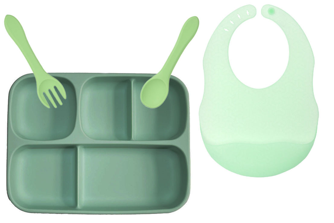Набор силиконовой посуды, разработан и создан с учётом всех требований мам для кормления детей от 1-го месяца состоит: Cиликоновая пяти-секционная тарелка Ложка Вилка Слюнявчик Набор посуды из силикона обладает рядом преимуществ и достоинств перед другими видами детской посуды: 1.Посуда из пищевого силикона не бьется и не имеет запаха 2. Представленный набор посуды имеет нужные изгибы для удобства при эксплуатации 3.Посуда изготовлена из пищевого силикона соответствует всем международным стандартам качества 4.Посуду можно стерилизовать и мыть в посудомоечной машине 5.Силиконовую посуду можно использовать в духовке, в пароварке или в СВЧ 6.Силиконовая тарелка: снабжена присоской, что обеспечивает устойчивость посуды на столике для кормления или на любой другой гладкой и чистой поверхности. 7.Вся посуда сохраняет свой первоначальный вид в течении всего срока эксплуатации. Секционная силиконовая тарелка с пяти секций на присоске. В ней можно готовить пищу для ребёнка, совмещать разные виды продуктов по консистенции и по температуре. Тарелка снабжена присоской на дне и не скользит по поверхности столика, - это особенно удобно когда малыш захочет учиться кушать самостоятельно, но также есть выступ, что бы легко отцепить липучку. Тарелка снабжена присоской на дне и не скользит по поверхности столика, - это особенно удобно когда малыш захочет учиться кушать самостоятельно, но также есть выступ, что бы легко отцепить липучку. В комплекте с тарелкой идет удобная силиконовые ложка и вилка, которые обеспечивают комфортный и удобный захват пищи. Эти универсальные ложка и вилка идеально подходят для детей разного возраста, обеспечивая мягкий и безопасный контакт с пищей. Ложка и вилка не повредят нежные ещё не окрепшими десна и первые зубы малыша даже при нажатии на столовые предметы. Дополнительно в комплект входит стильный слюнявчик из мягкого силикона. Он предназначен для защиты одежды от попадания пищи и жидкости, что делает его идеальным аксессуаром для кормления малышей или для использования во время приема пищи в дороге. Наша рекомендация: перед использованием промыть теплой водой с добавлением нейтрального моющего средства. О разнице в цвете: Все товары сделаны на натуральных фотографиях. Из-за различных мониторов и освещения при съемке, факторов окружающей среды и т. д., есть небольшая разница в цвете, которая объективна и ее нельзя избежать! Хроматическая аберрация не является проблемой качества.
