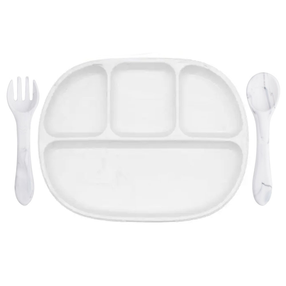Набор силиконовой посуды, разработан и создан с учётом всех требований мам для кормления детей от 1го месяца до 5 лет, состоит из 3 предметов: 1.Четырех-секционная силиконовая тарелка 2.Вилка 3.Ложка Набор посуды из силикона обладает рядом преимуществ и достоинств перед другими видами детской посуды: 1.Посуда из пищевого силикона не бьется и не имеет запаха 2. Представленный набор посуды имеет нужные изгибы для удобства при эксплуатации 3.Посуда изготовлена из пищевого силикона соответсвует всем международным стандартам качества 4.Посуду можно стерилизовать и мыть в посудомоечной машине 5.Силиконовую посуду можно использовать в духовке, в пароварке или в СВЧ 6.Силиконовые тарелки: секционная и круглая снабжены присосками, что обеспечивает устойчивость посуды на столике для кормления или на любой другой гладкой и чистой поверхности. 7.Вся посуда сохраняет свой первоначальный вид в течении всего срока эксплуатации. Секционная силиконовая тарелка с четырех секций на присоске. В ней можно готовить пищу для ребёнка, совмещать разные виды продуктов по консистенции и по температуре. Тарелка снабжена присоской на дне и не скользит по поверхности столика, - это особенно удобно когда малыш захочет учиться кушать самостоятельно, но также есть выступ, что бы легко отцепить липучку. Ложка и вилка с данного набора не повредят нежные ещё не окрепшими десна и первые зубики малыша даже при нажатии на столовые предметы. Особая форма и небольшой объём необходимы для плавного перехода малыша от груди к ложке. Наша рекомендация: перед использованием промыть теплой водой с добавлением нейтрального моющего средства. О разнице в цвете: Все товары сделаны на натуральных фотографиях. Из-за различных мониторов и освещения при съемке, факторов окружающей среды и т. д., есть небольшая разница в цвете, которая объективна и ее нельзя избежать! Хроматическая аберрация не является проблемой качества.