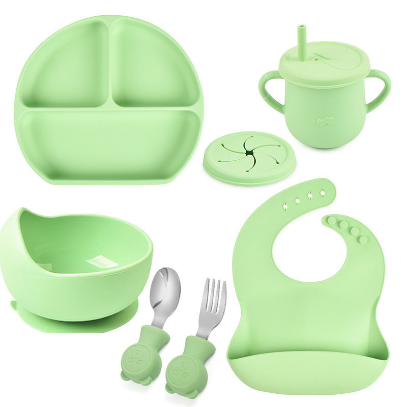 6.Силиконовые тарелки: секционная и круглая снабжены присосками, что обеспечивает устойчивость посуды на столике для кормления или на любой другой гладкой и чистой поверхности.