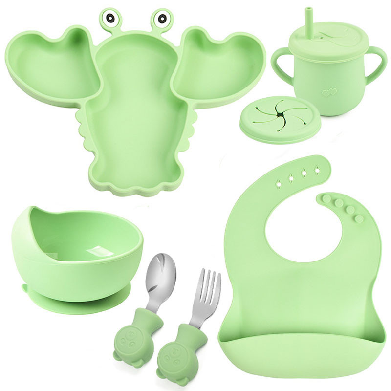 Набор силиконовой посуды, разработан и создан с учётом всех требований мам для кормления детей от 4х месяцев до 5 лет, состоит из предметов: 1. Трёхсекционная силиконовая тарелка 2. Круглая тарелка на присоске для первых блюд 3. Силиконовый слюнявчик с регулируемой застежкой и карманом 4. Вилка 5. Ложка 6. Поильник-непроливайка Набор посуды из силикона обладает рядом преимуществ и достоинств перед другими видами детской посуды: 1.Посуда из пищевого силикона не бьется и не имеет запаха 2. Представленный набор посуды имеет нужные изгибы для удобства при эксплуатации 3.Посуда изготовлена из пищевого силикона и соответсвует всем международным стандартам качества 4.Посуду можно стерилизовать и мыть в посудомоечной машине 5.Силиконовую посуду можно использовать в духовке, в пароварке или в СВЧ 6.Силиконовые тарелки: секционная и круглая снабжены присосками, что обеспечивает устойчивость посуды на столике для кормления или на любой другой гладкой и чистой поверхности. 7.Вся посуда сохраняет свой первоначальный вид в течении всего срока эксплуатации. Секционная силиконовая тарелка с трех секций на присоске в форме рака. В ней можно готовить пищу для ребёнка, совмещать разные виды продуктов по консистенции и по температуре. Тарелка снабжена присоской на дне и не скользит по поверхности столика - это особенно удобно когда малыш захочет учиться кушать самостоятельно, но также есть выступ, что бы легко отцепить липучку. Тарелочка круглая силиконовая на присоске, ее достаточно, как для начала первого прикорма так и для последующего кормления ребёнка. Слюнявчик - незаменимая вещь при кормлении малыша. Максимум комфорта для ребёнка и минимум уборки для мамы. Компактный и удобный в использовании для дома, детского сада, поездок, прогулок. Не требует стирки. Нагрудник достаточно протереть тряпочкой или салфеткой. Кармашек для улавливания пролитой еды отлично защищает одежду от загрязнений. Набор столовых приборов - это идеальные решение для начала прикорма. Металлические элементы обеспечивают прочность и долговечность, а силиконовые ручки делают их удобными в использовании. Этот набор приборов идеально подходит для ежедневного использования и обеспечивает надежное и удобное взаимодействие с пищей. Силиконовый поильник для детей 3в1 чашка силиконовая с ручками, снечница, поильник с трубочкой. Данный поильник можно видоизменить благодаря специальным крышкам: это может быть Обучающий поильник, затем когда малыш подрастёт, он может быть Снек-стаканчиком - это как непроливайка для напитков, только непросыпайка для печенек, ягод, фруктов и многого другого. А когда малыш научится пить и кушать самостоятельно поильник станет Универсальной чашкой для разных напитков. Изделие изготовлено из 100% пищевого силикона и пригодно, как для горячих так и для холодных напитков. Наша рекомендация: перед использованием промыть теплой водой с добавлением нейтрального моющего средства. О разнице в цвете: Все товары сделаны на натуральных фотографиях. Из-за различных мониторов и освещения при съемке, факторов окружающей среды и т. д., есть небольшая разница в цвете, которая объективна и ее нельзя избежать! Хроматическая аберрация не является проблемой качества.